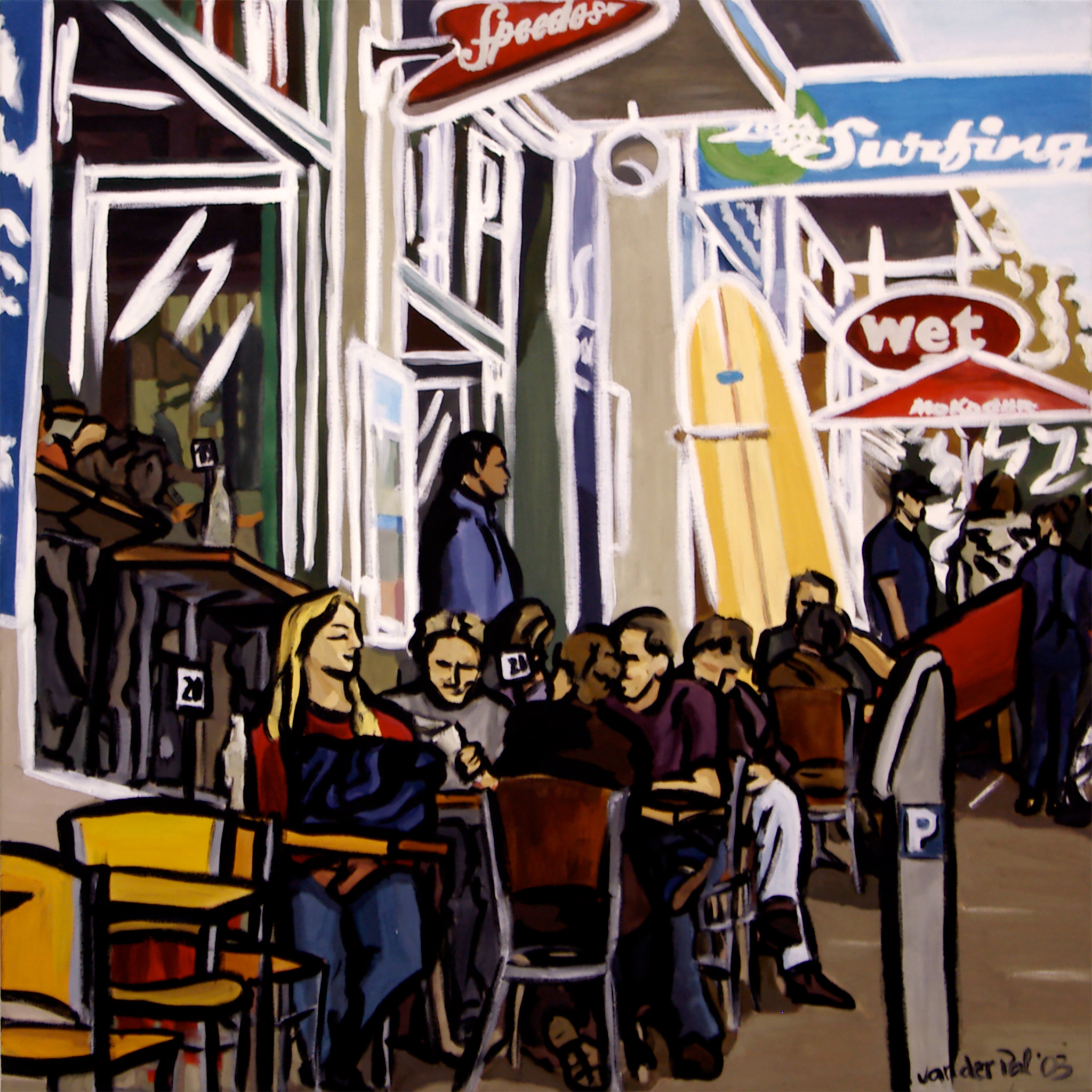 Weergeving van sociaal en cultureel unieke momenten in een grafisch beinvloede schilderstijl, olieverf op doek.