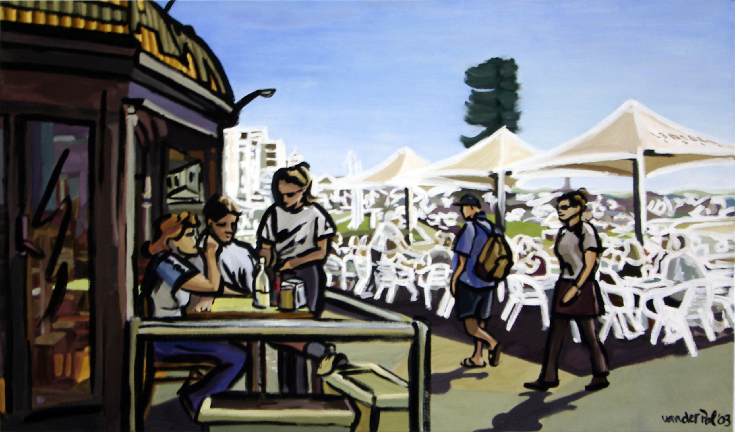 Weergeving van sociaal en cultureel unieke momenten in een grafisch beinvloede schilderstijl, olieverf op doek.