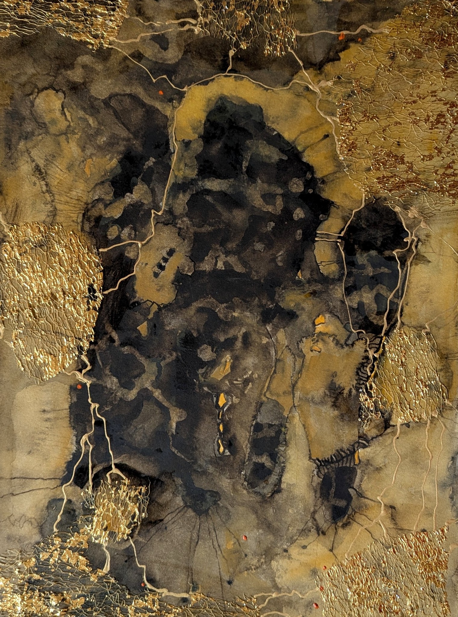 In de coronatijd startte ik met een reeds schilderijen op 360grams papier, THE VIRUS. Met lange tussenpozen werkte ik eraan. De 'goldrush' verwijst naar de grootschalige, stormachtige migratie van mensen naar ontdekte goudvelden, vanaf de 17de tot de 20ste eeuw. Vooral in Canada, de Verenigde Staten, Australië en Nieuw-Zeeland. Tijdens onze rondreizen in de USA en Nieuw Zeeland bezochten we enkele van de plaatsen die nu gecultiveerd worden als 'Ghost Town', zoals Bodie (California ) op het Zuidereiland van Nieuw Zeeland (Westcoast, Otago). Materialen: acryl, bister, goudkleurig gaas