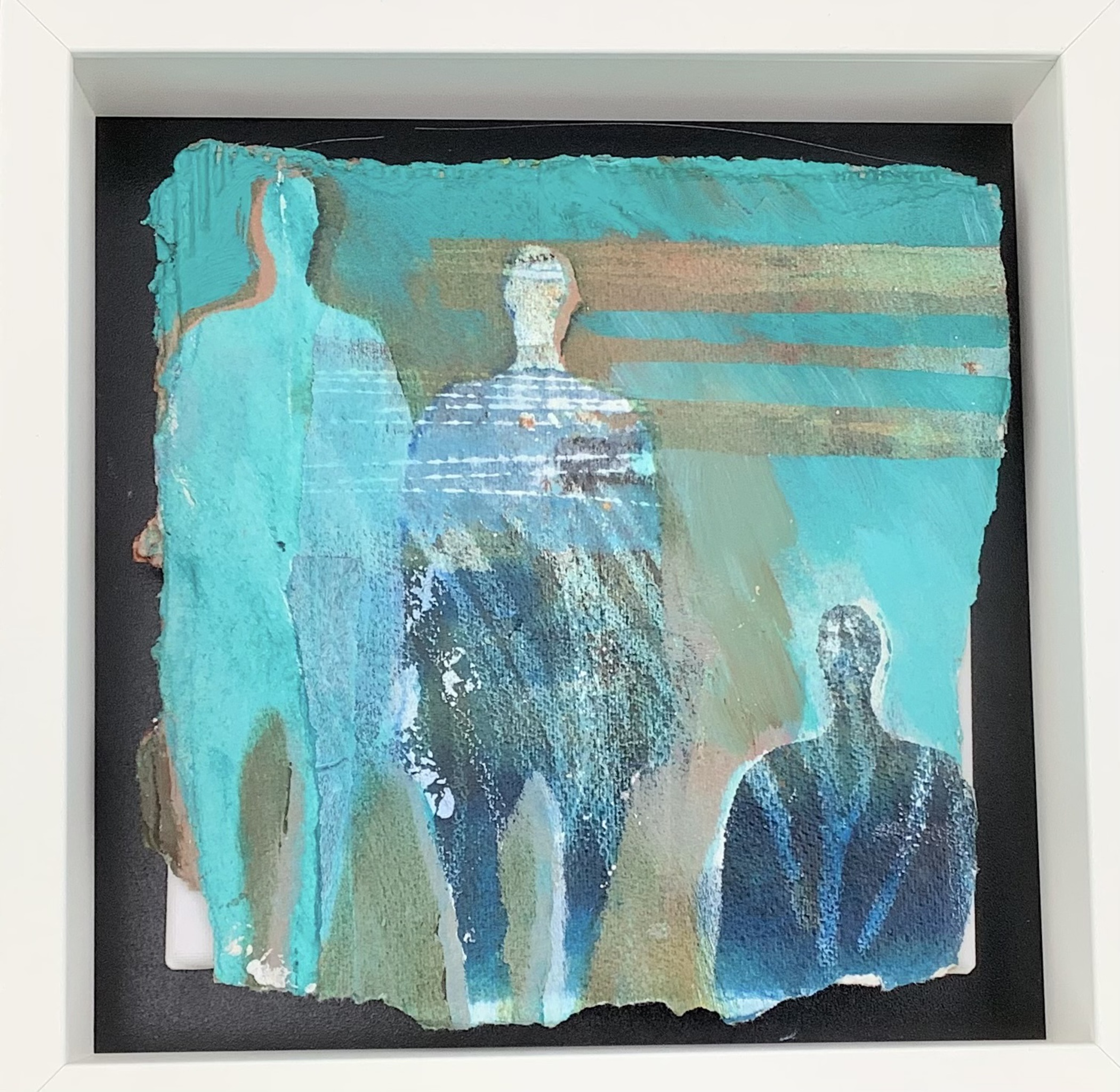 Een grillig gescheurd stuk karton ,wat ik heb geprepareerd en geplaatst in een zwart kastje. Daarop figuren in blauwige kleuren.