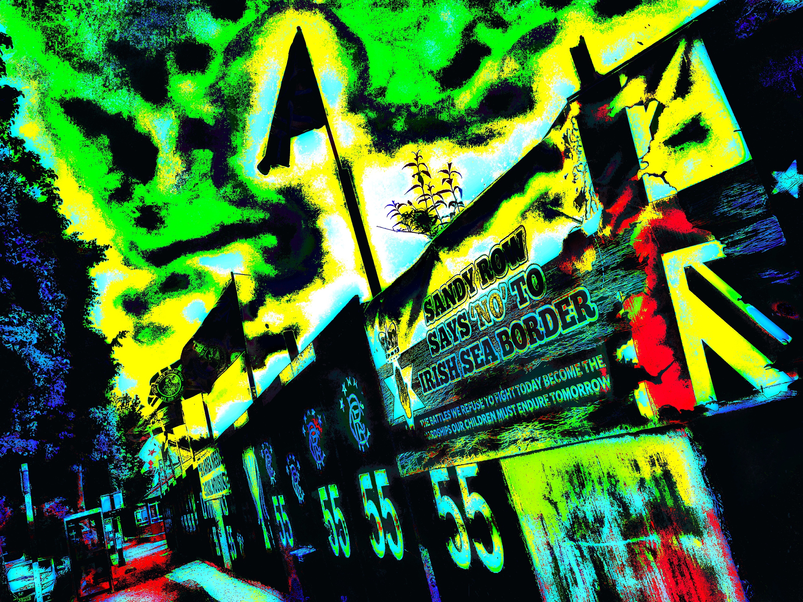 "Sandy Row says NO!" is een digitale foto uit de serie "Traces of a Troubled History" in de anthologie "OUT!! Northern Ireland/ The North of Ireland" dat verhaalt over de geschiedenis van the Troubles en de nasleep. Afmetingen zijn in pixels in plaats van cm