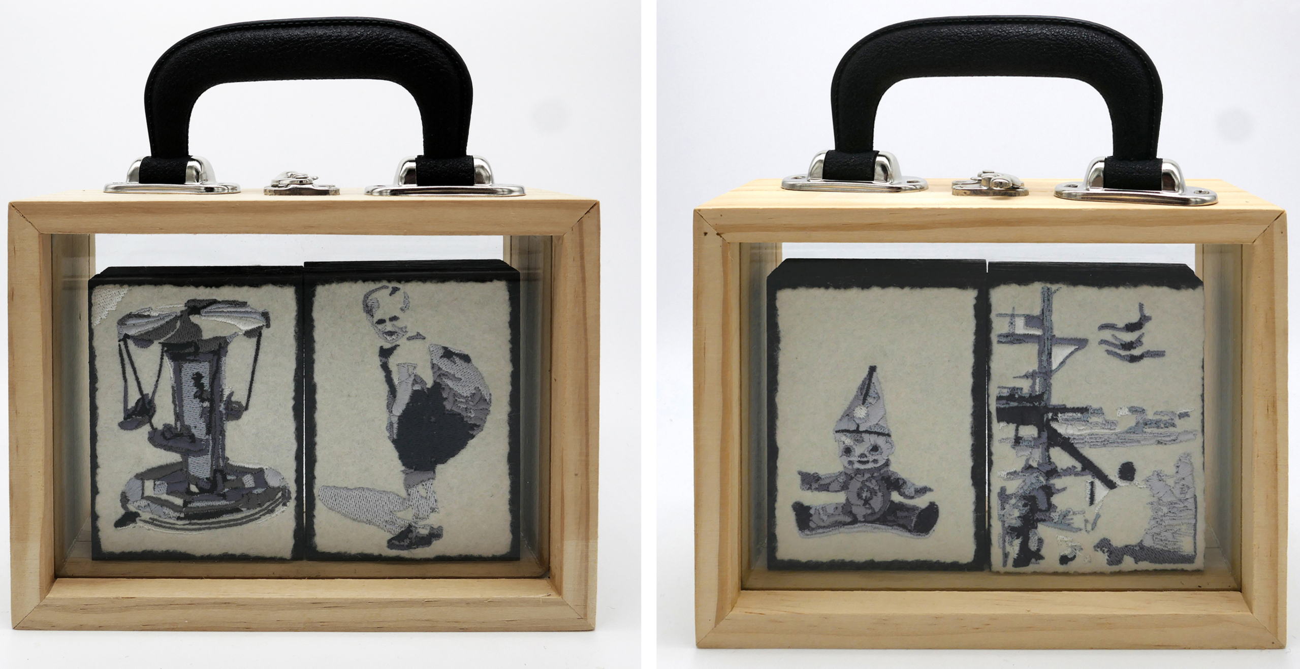 4x borduurwerk uit de serie "Gekleurde beelden", speciaal in een kinder-koffertje geplaatst voor "Journey of Freedom" (herdenking 80 jaar bevrijding in Ede). Houten doos, glas, handvat, glansgaren op wolvilt.
