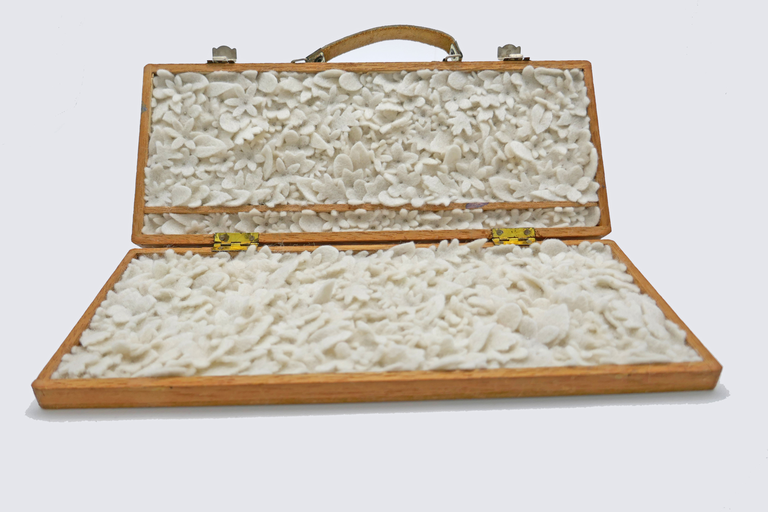 Kinder-koffertje voor "Journey of Freedom" (herdenking 80 jaar bevrijding in Ede). Verfdoos, wolvilt, foam, spelden.