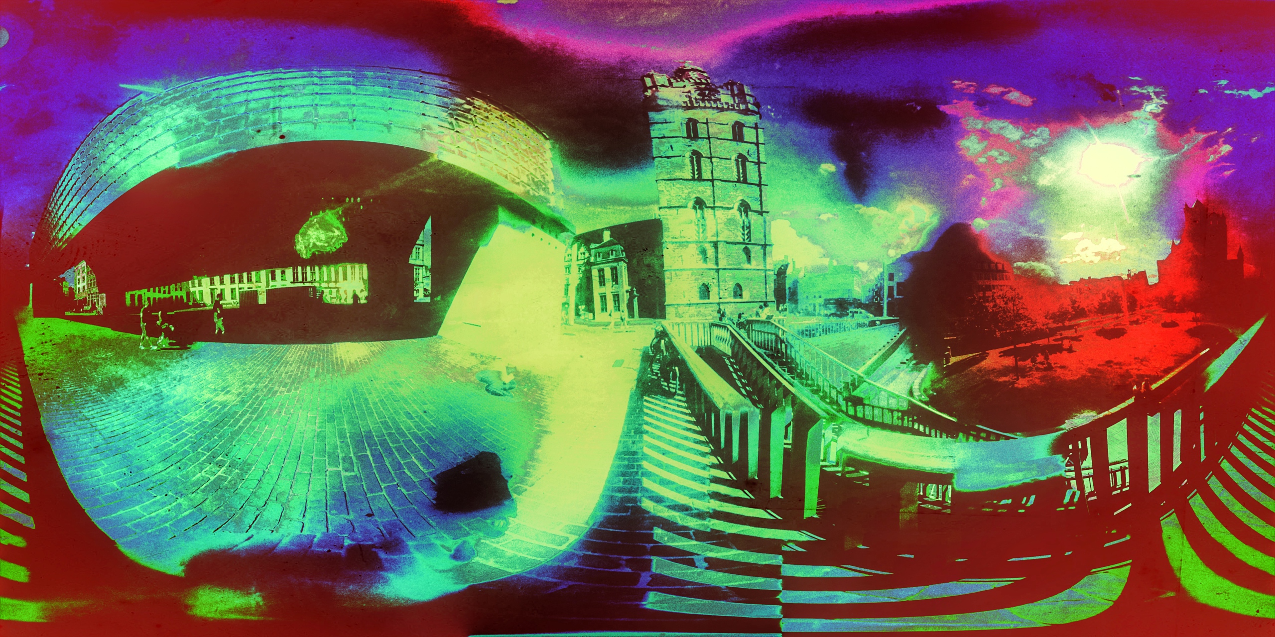 " 't Belfort tijdens lockdown" is een 360-graden panorama gemaakt met een analoge filter die komt uit de serie Symptoms of COVID19 en laat een van de normaal drukste locaties in het centrum van de Vlaamse stad Gent zien tijdens de lockdown in april 2021. (de dimensies zijn in pixels en niet in cm)