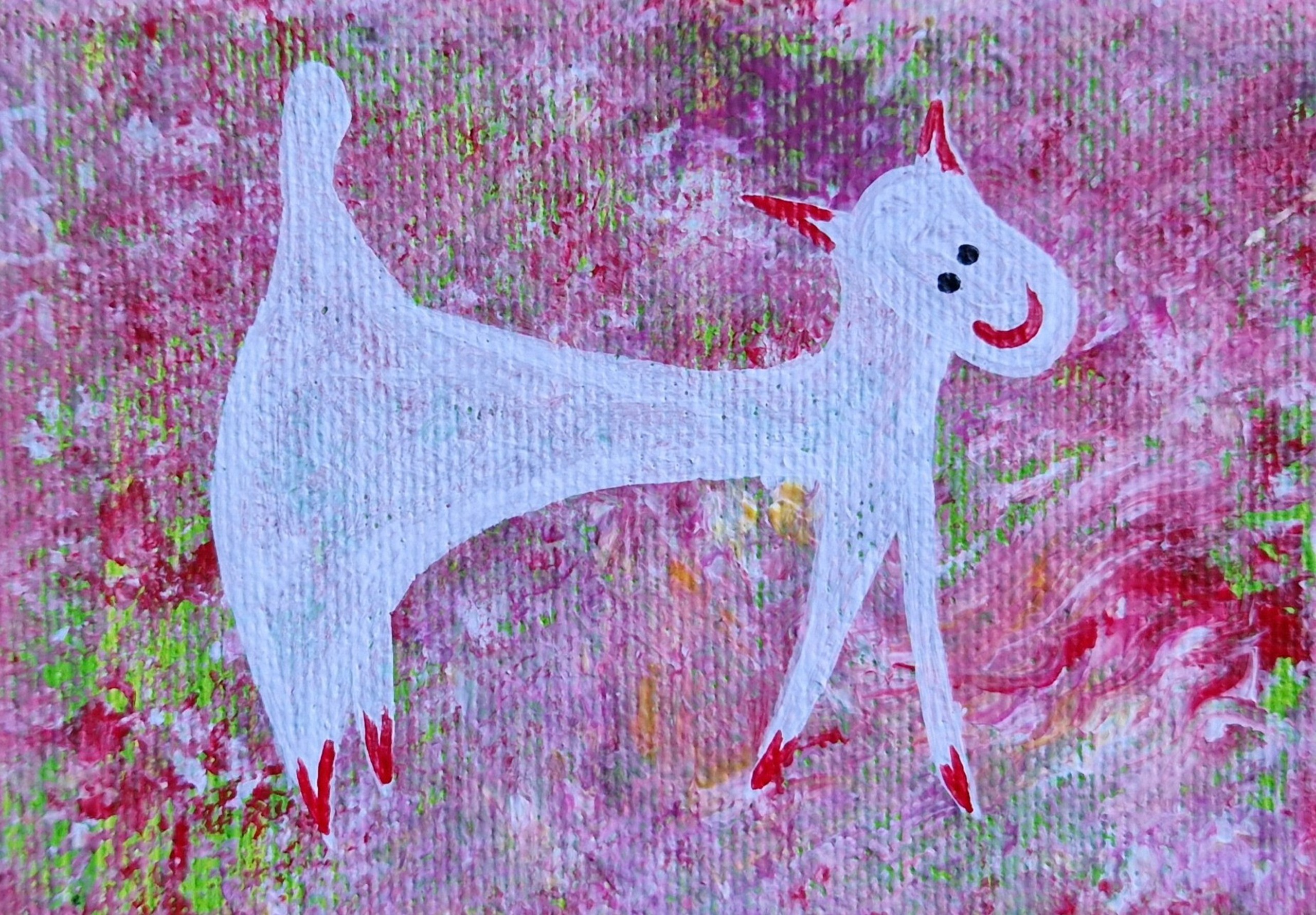 Minischilderijtje, 7 bij 10 cm, acrylverf op katoen, met ophanghaakje, Pictoright. Als je je abonneert op mijn maandelijkse gratis nieuwsbrief, zie linksonder bij ‘contact’, ontvang je 10% korting bij aanschaf van dit werkje. De prijs is inclusief verzendkosten binnen Nederland. De achtergrondkleuren zijn in werkelijkheid net iets anders, dus voor aanschaf even beelbellen is handig.