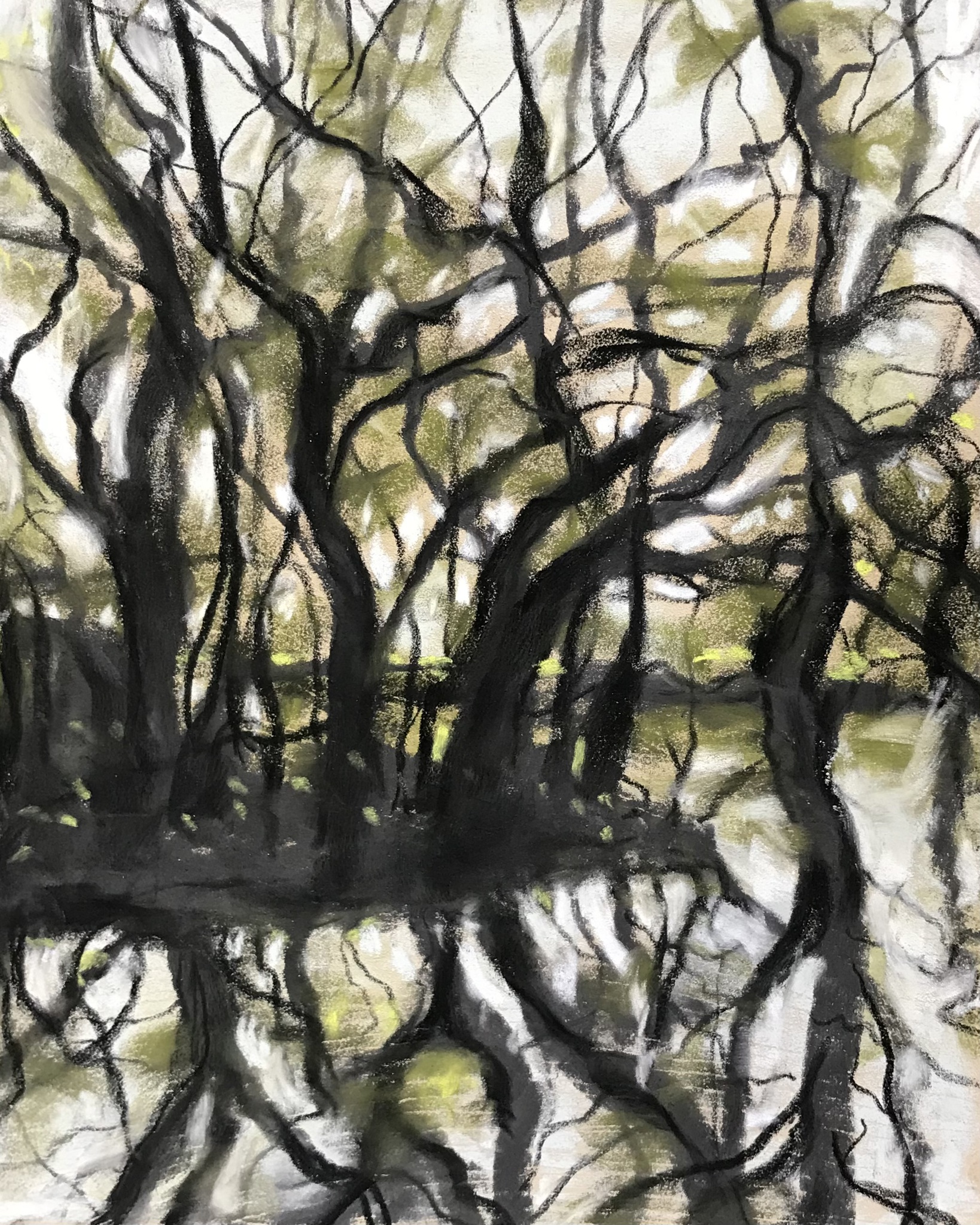 In het park is een vijver met een klein eiland. Op het eiland staan bomen en struiken die een prachtige spiegeling geven in het water. Het spreekt tot m'n verbeelding, een klein mysterie!