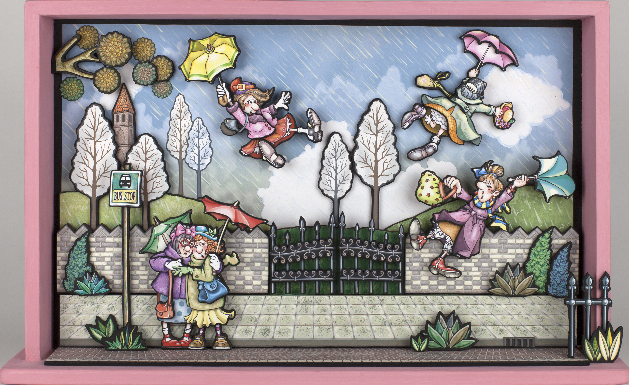 Het liefst maak ik verhalende tekeningen met wat humor, geplaatst in drie-dimensionale houten kistjes. Maar ook beeldhouwwerk, keramiek en textiel. Altijd figuratief met veel details.