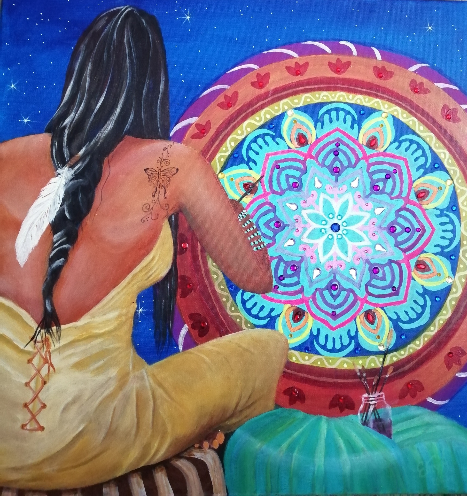 Ieder mens, in iedere cultuur bezit een creatief vermogen. De Native Americans hebben verschillende symbolisaties, verschillend per tribe. O.a. veren brengen boodschappen vanuit de spirituele wereld en met name witte veren. Gems vertegenwoordigen de edelstenen uit de natuur, met hun eigen spirituele en symbolische betekenissen. Sieraden zijn een persoonlijke uiting die hun eigen betekenissen hebben, net als kunst. Zo heb ik dit schilderij ook gemaakt vanuit een persoonlijke symbolisatie.