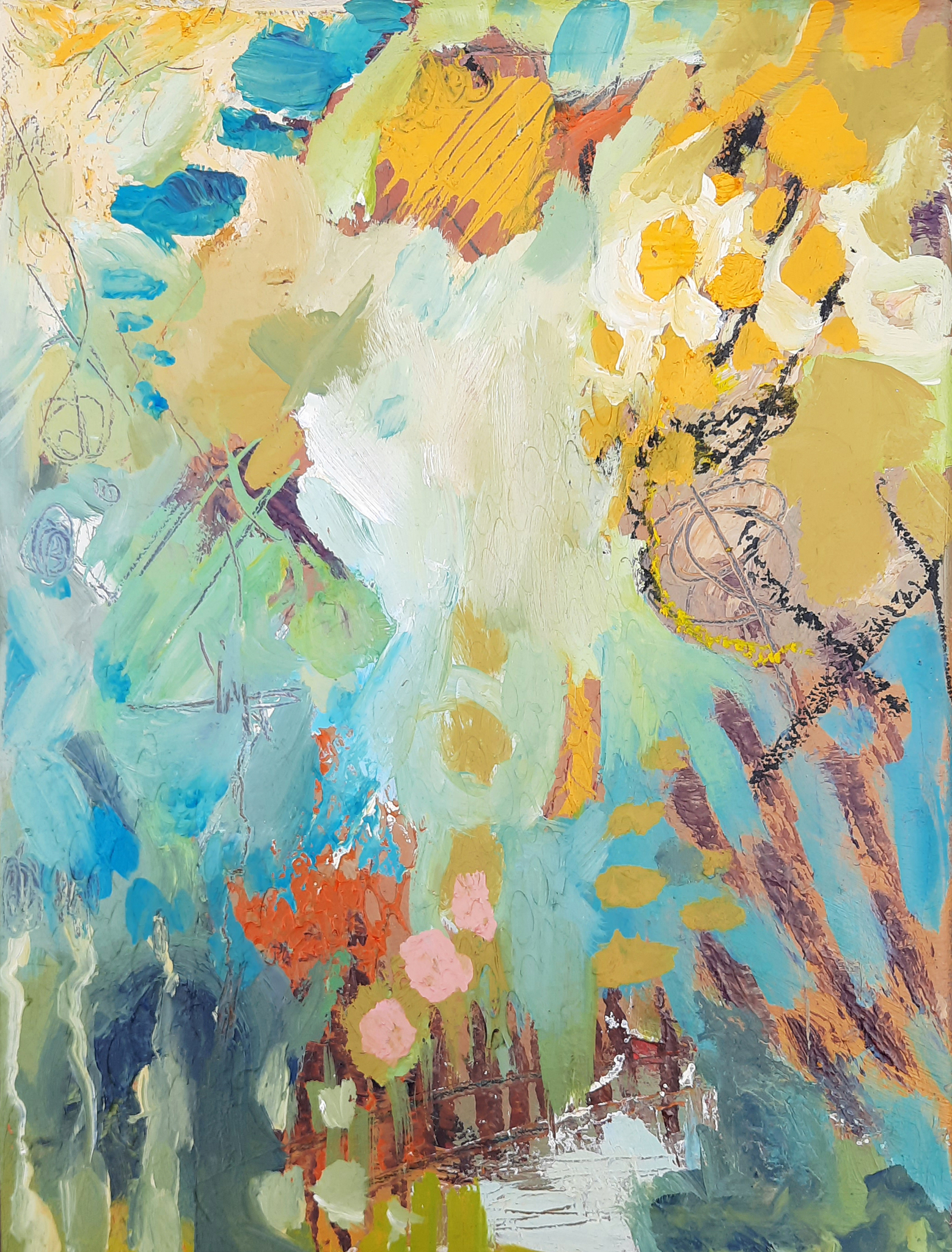 Schilderij Abstract Modern Geel Expressie Bruin Beweging Roze Vrolijk Lente Warm Zeegroen Voorjaar Turquoise Energie Happy Ontluiken