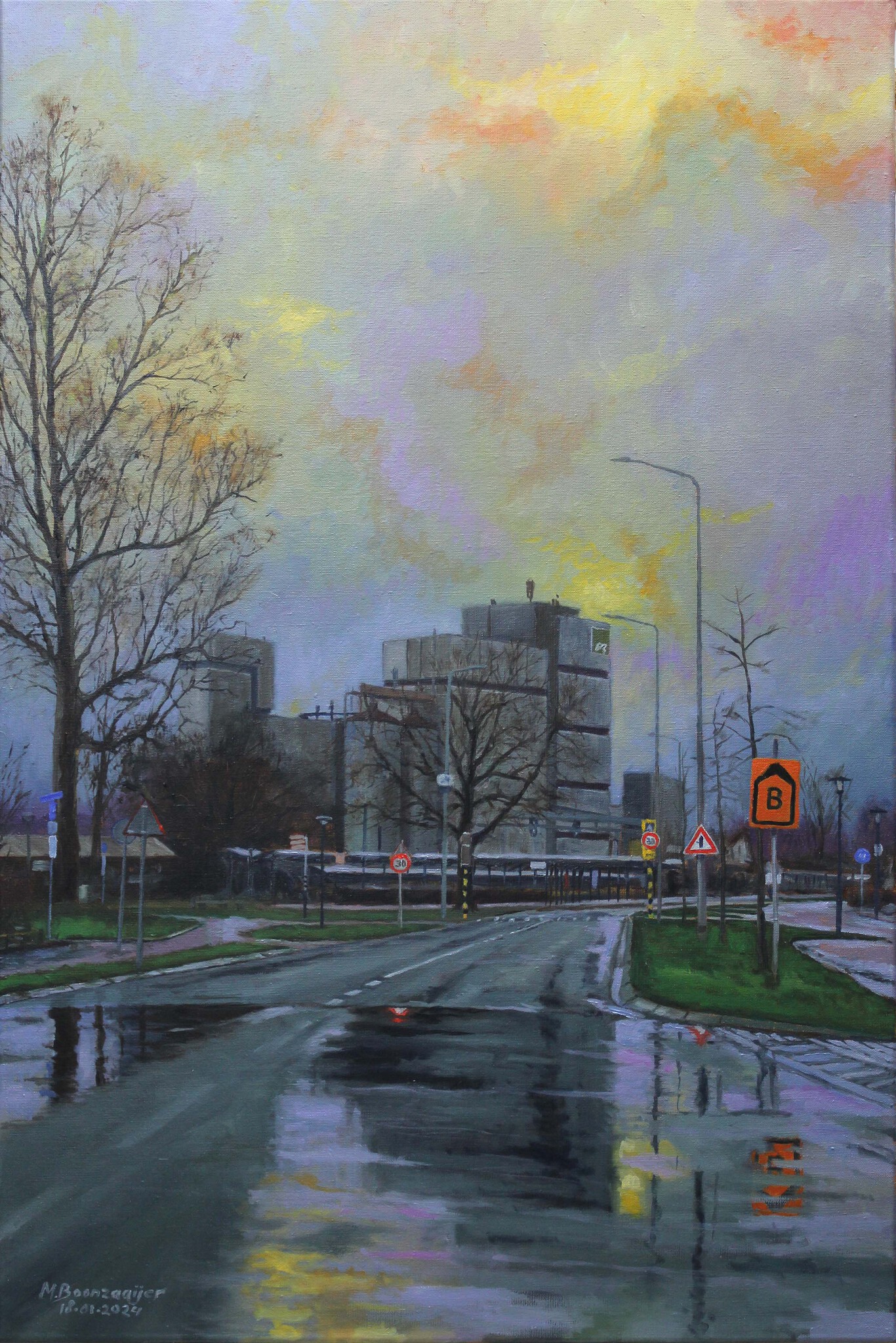 Naar een foto die ik vanuit een rijdende auto nam, in mijn woonplaats Barneveld. Olieverf op linnen, 90 x 60 cm. 18 januari 2024. Voorzien van een baklijst.