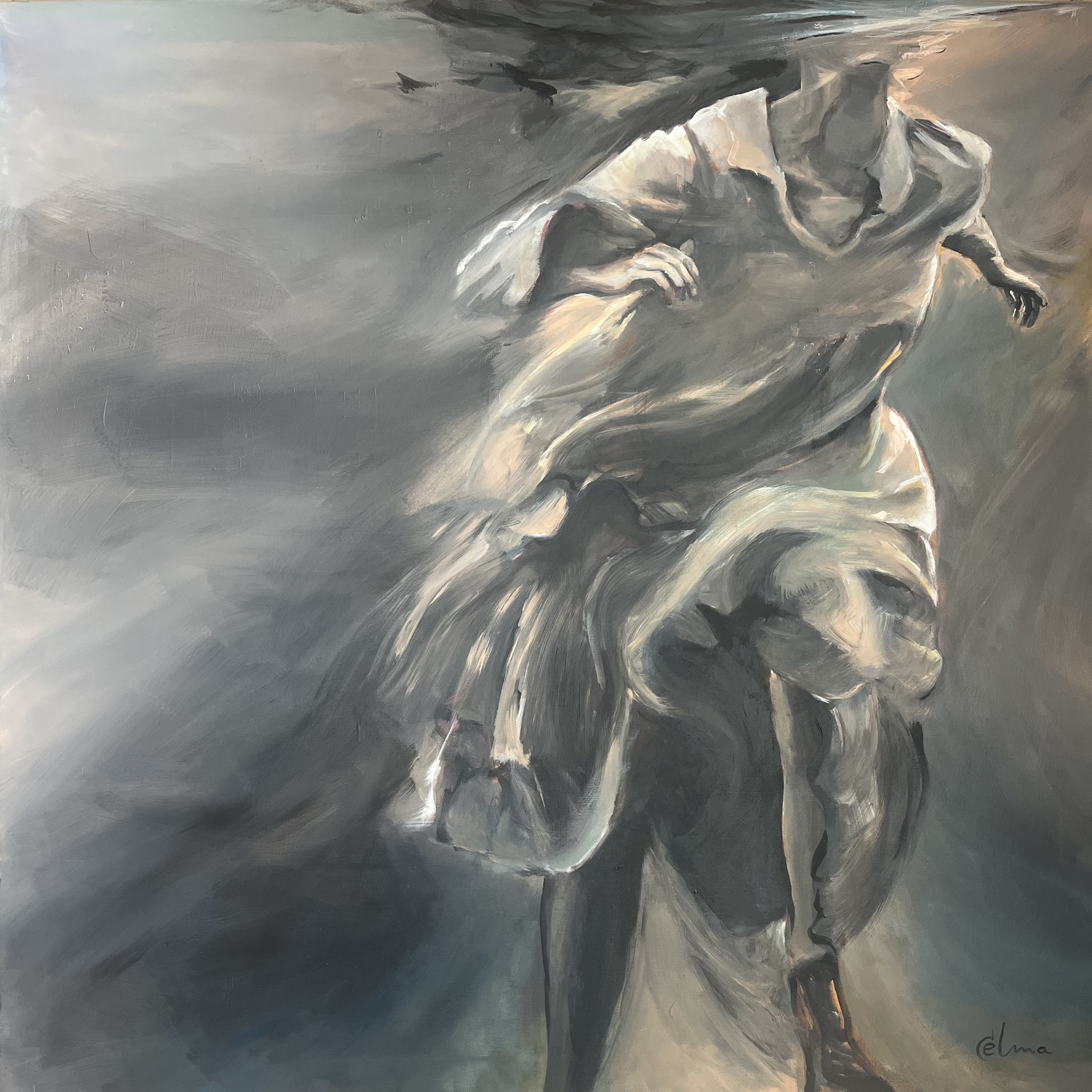 Schilderij Grijs Zwart Acryl Vrouw Beweging Moeizaam