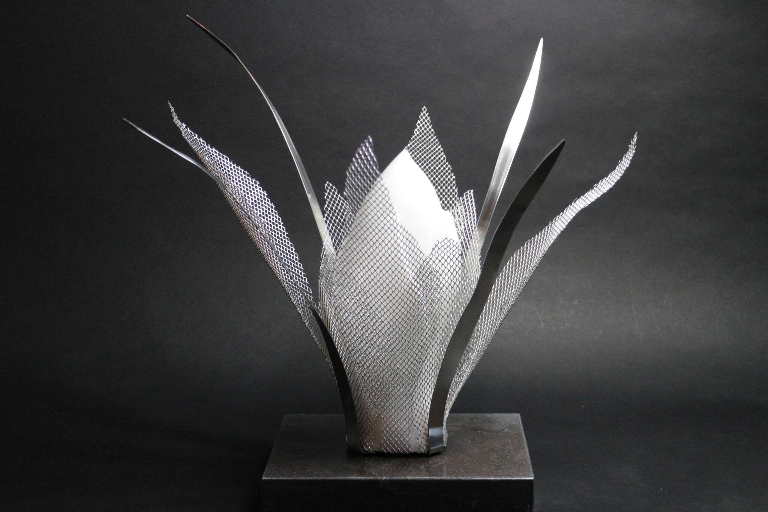 Popping Flower geeft de groei weer van een bloemknop, een ontluikende bloemknop. Het fragiele van een bloemknop zie je af aan de bladeren, die gemaakt zijn van aluminiumgaas. Die bladeren beschermen aanvankelijk de knop, maar na het uitkomen van de bloem zijn ze niet echt meer nodig. Het gaas is vrij kwetsbaar, maar ook beschemend: het is scherp aan de randen zodat het niet makkelijk is de knop te benaderen. De knop zelf is gemaakt uit marmer en de stips die ook een beschermende functie hebben zijn gemaakt van RVS. Het geheel is bevestigd op een hardstenen siokkel.