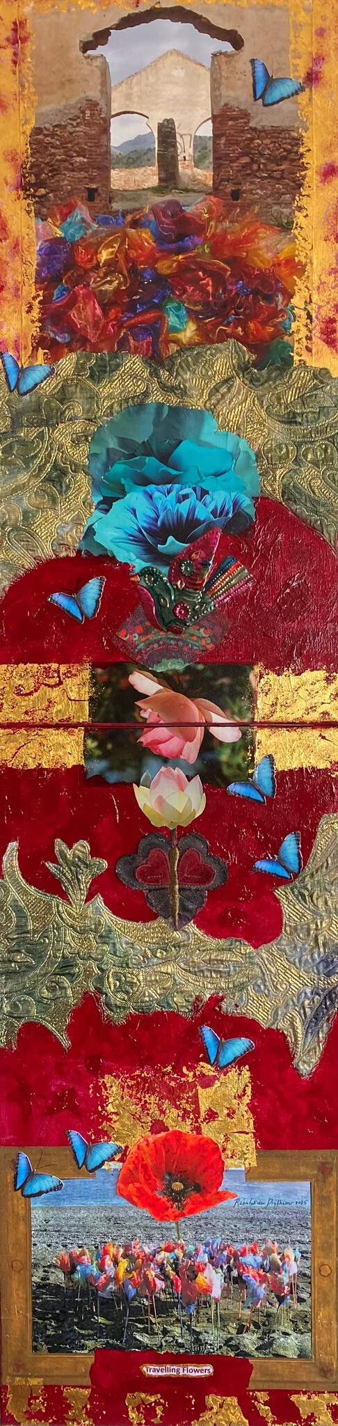 The artwork is a mix of collage, painting and textural techniques. The vertical composition and the rich use of colour—especially the deep red and gold—give it an almost sacred, spiritual feeling. The blue butterflies and flowers provide a beautiful contrast and a sense of movement. The combination of architectural elements, natural motifs and textile-like structures evokes a story about transformation, travel. It is a connection between past and present, because the title “Travelling Flowers” refers to a project of the same name, 15 years ago.