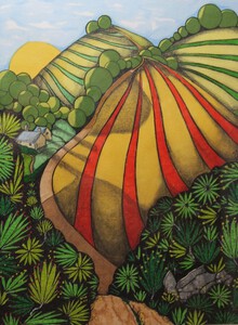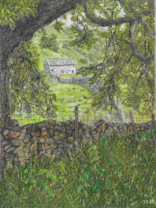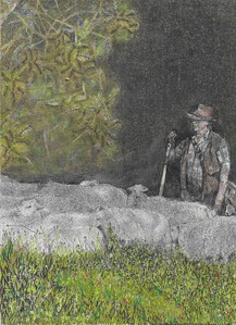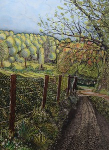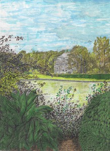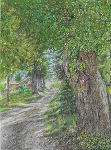 Deze tekening vangt het gevoel van een rustige nazomerdag, waarin licht en schaduw zacht met elkaar spelen. Het pad dat door het beeld slingert trekt je meteen naar binnen: niet omdat het haast heeft, maar omdat het rustig en vanzelfsprekend richting geeft. De oude bomen die het pad flankeren vormen een levende zuilengang. Rechts valt een grote boom extra op. In zijn ruwe, gegroefde bast hangt een klein rood kapelletje met een kruisje erboven – een teken van devotie, bescherming of traditie. Het is alsof iemand ooit stopte om een moment van dankbaarheid, troost of stilte aan deze plek te schenken. Links, half verscholen tussen de bladeren, staat een rood huis. Het voegt een warme, menselijke aanwezigheid toe zonder het bos te verstoren. De kleuren van het gebladerte – van frisgroen tot warm goud – suggereren dat de zomer langzaam overgaat in de herfst. Samen schetst de tekening een moment waarin natuur, geschiedenis en menselijke aanwezigheid in balans zijn. Het pad, de bomen en het kleine kapelletje nodigen uit tot bezinning, terwijl het licht een zachte warmte achterlaat. Het is een beeld dat je uitnodigt om even te blijven staan, te ademen en te luisteren naar de stille overgang van de tijd.