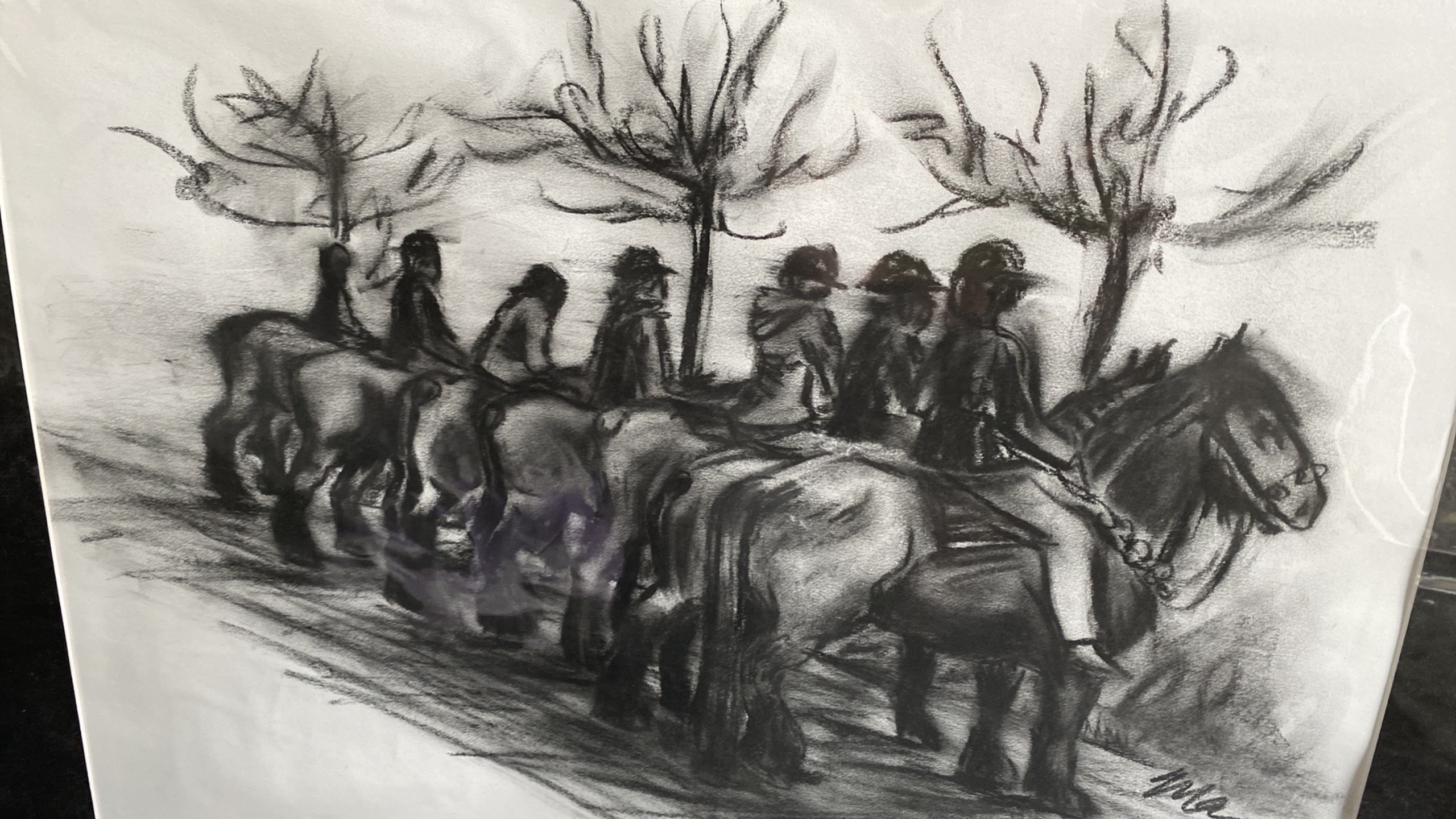 Deze originele houtskooltekening is met een zwart passe-partout ingelijst. (geïnspireerd bij de Strao Renesse Zeeland). Versierde Paarden en zijn ruiters wachten af in het centrum voordat de lange tocht naar het strand begint. Afmeting 55x64cm. De conditie is perfect. Zit ingepakt in transparant cadeaupapier. In het begin van het jaar werk paarden werden naar het strand gebracht om hun benen te wassen. Deze traditie wordt elk jaar in verschillende dorpen in Zeeland gehouden met taaloze paarden die naar het strand worden gereden. De galoperende paarden in de branding, dit is een prachtige spektakel. De houtskool tekening is gesigneerd bij Ena Marie Rivera Mestey 2015.