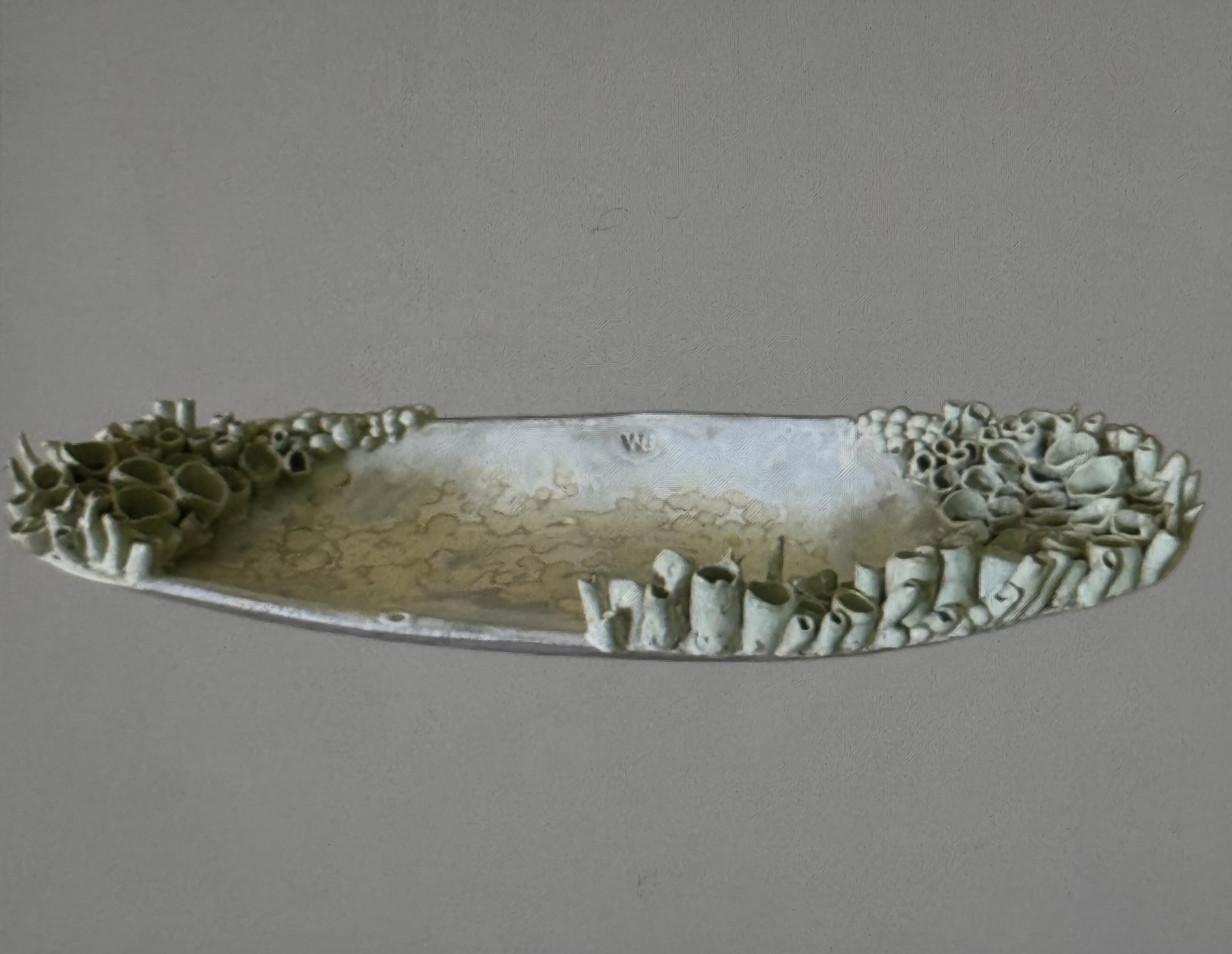Een schaal uit de serie zeeschalen, steengoed gebakken en geglezuurd