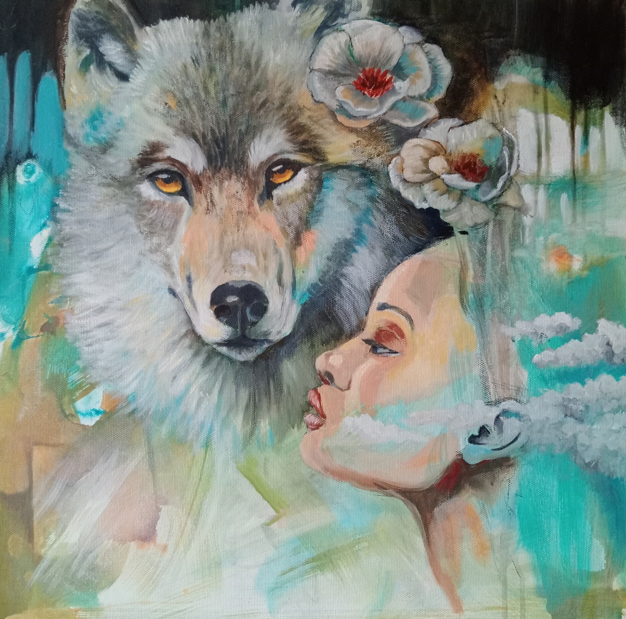 De overwegend koele tinten van de abstracte achtergrond inspireerden me voor het schilderen van de vrouw, de wolf en de bloemen. Het geheel heeft een winterse uitstraling, vandaar de titel.
