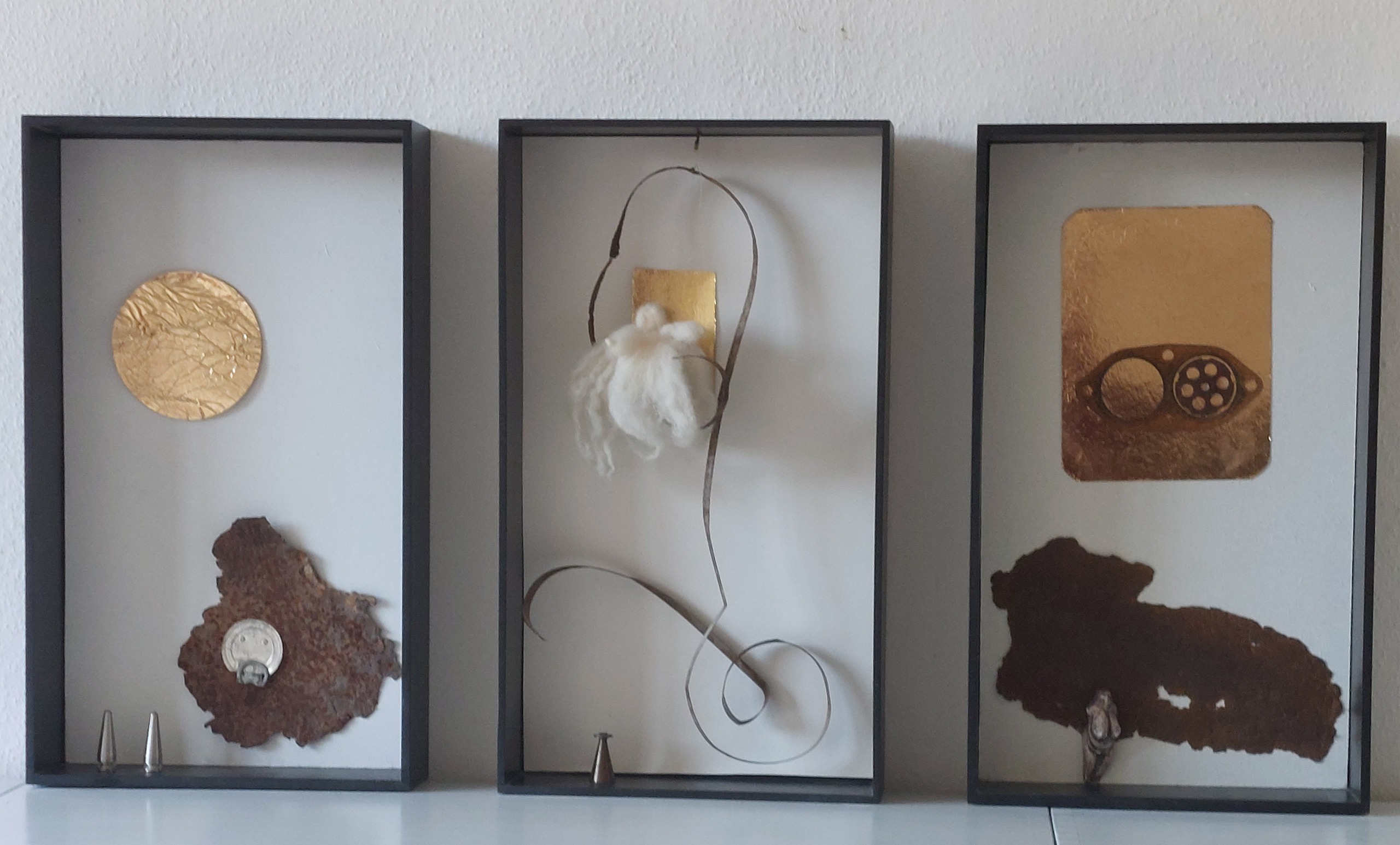 Gevonden voorwerpen in 3 zwart geschilderde kasten met witte achtergrond binnenin