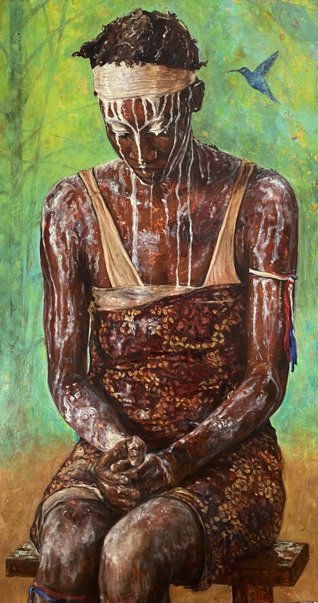 Breaking generational pattern. Dit beeld maakt deel uit van de documentaire Veerkracht van Daphne Caprino. De documentaire gaat over de zwarte slavenhouders. De verbinding die we hebben met voorgaande generaties en dat we de trauma's mogen helen, opdat we deze niet doorgeven aan onze kinderen, staat voor mij centraal en wordt uitgebeeld middels deze vrouw tijdens een Winti ritueel.