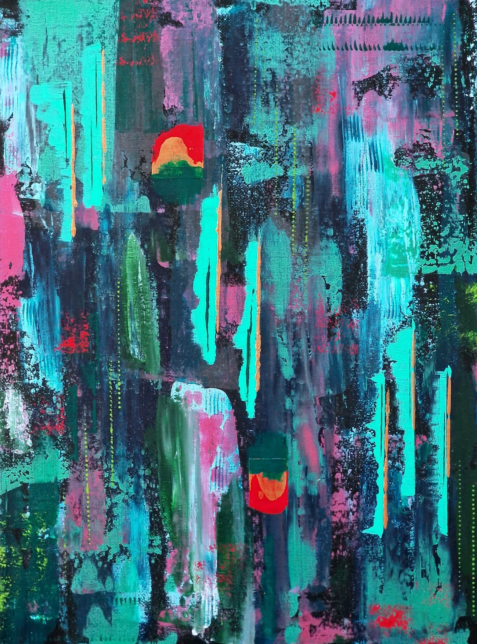 Dit werk speelt met contrast en kleur: turquoise, roze en diepgroen wisselen elkaar af, met kleine warme accenten. Een abstracte reflectie op momenten van stilte en groei. De prijs is inclusief luxe lijst.