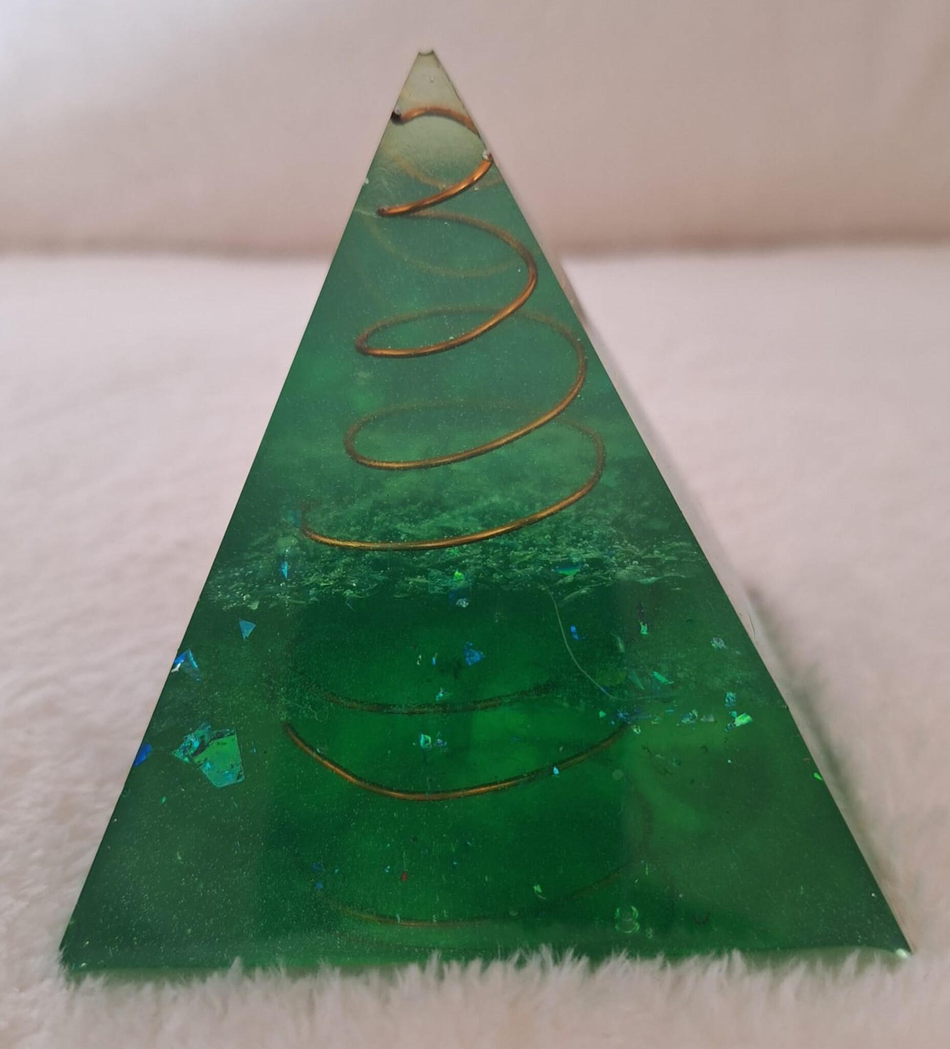 Orgonite / piramide groen met koperspiraal en stukjes glitter
