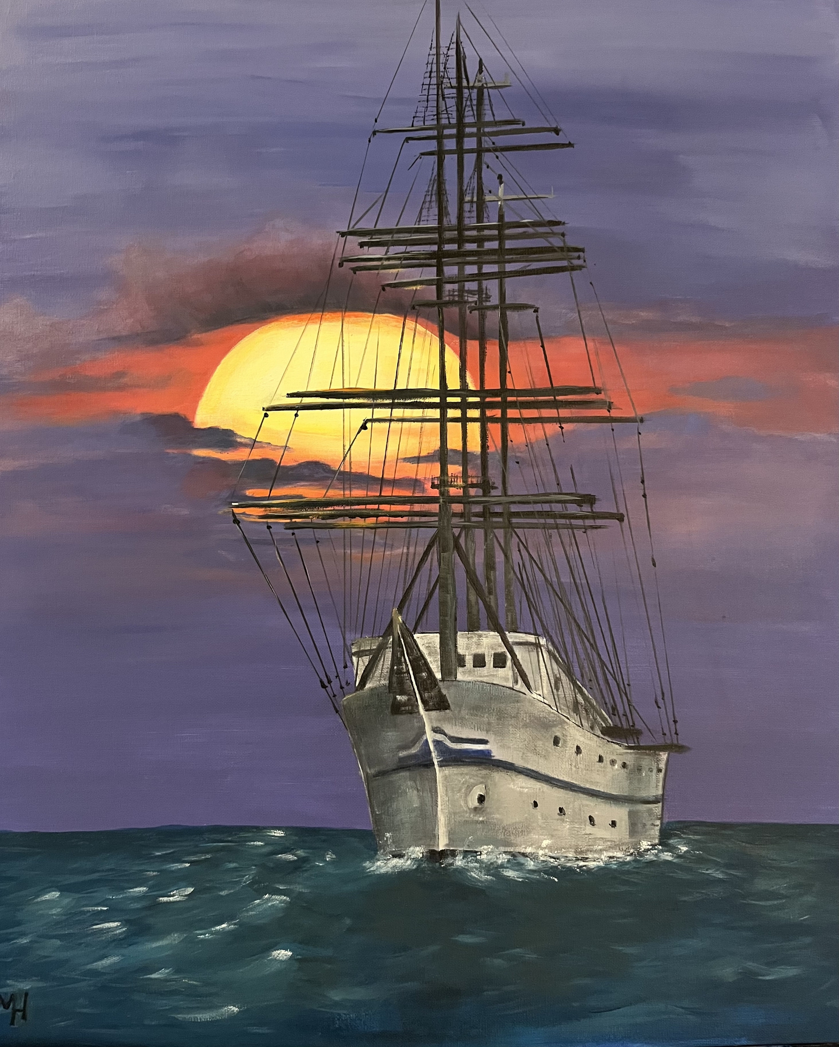 Avondkoers Een imposant schip vaart kalm de ondergaande zon tegemoet. De reflectie van het licht en de diepe kleuren van zee en lucht brengen rust en kracht samen. Acryl op canvas paneel, 50 x 60 cm inclusief lijst.