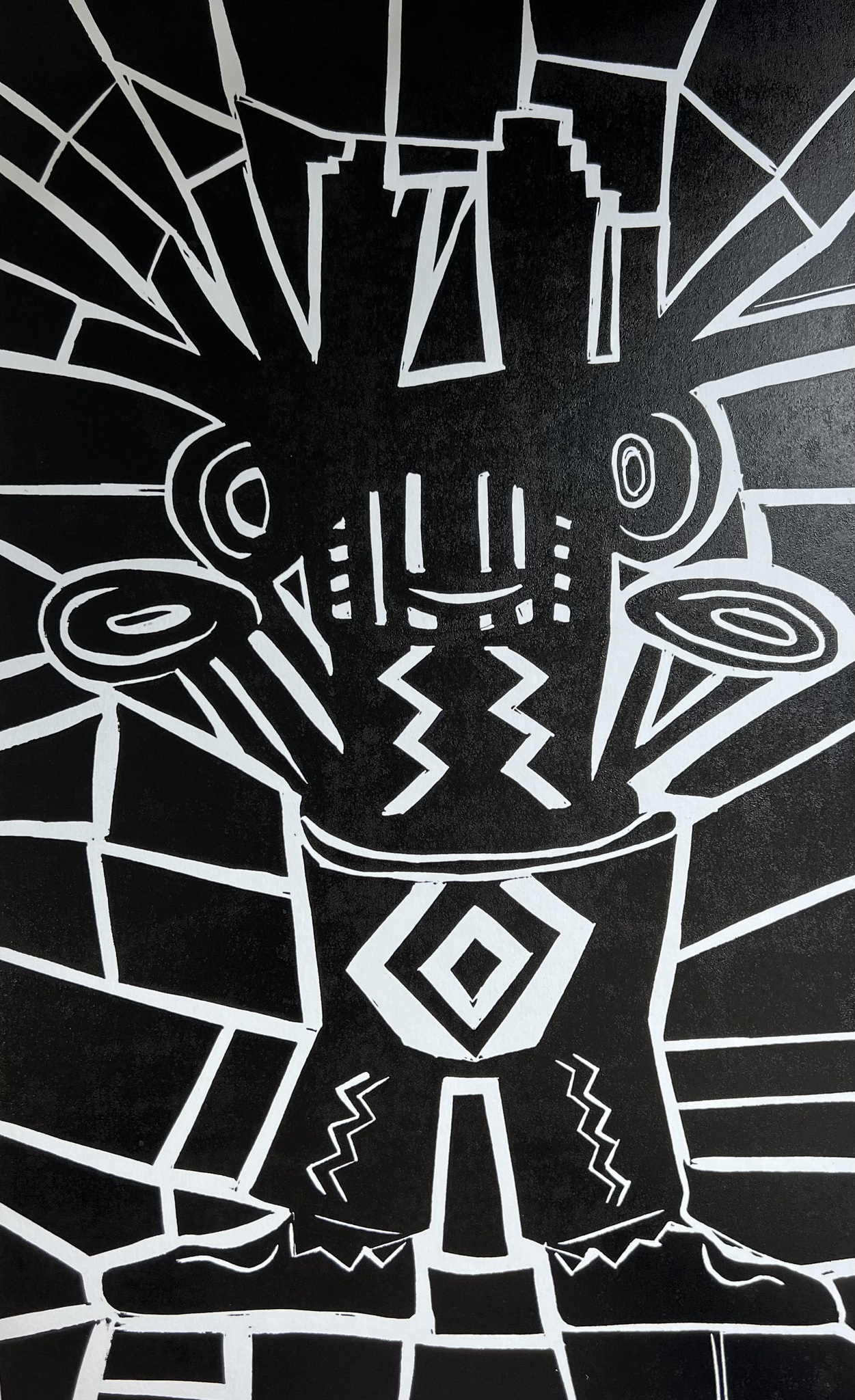 Linoleum print, geinspireerd op een beeldje van een totumpaal, nu met mozaik omlijsting.