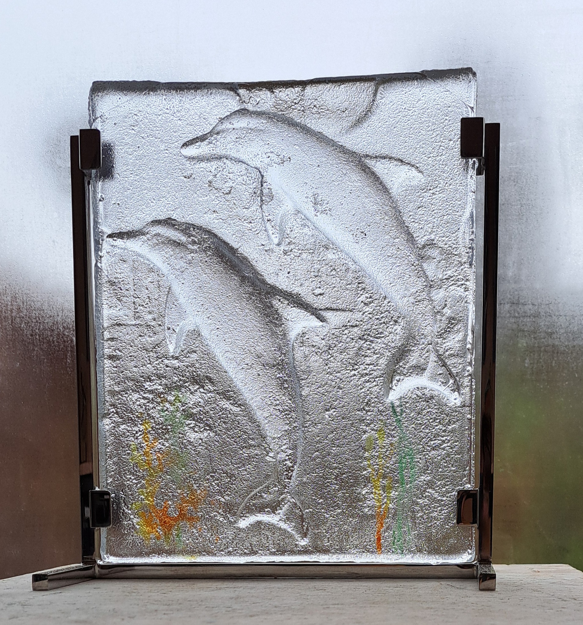 Twee dolfijnen in de techniek hot glass casting in een frame van rvs.