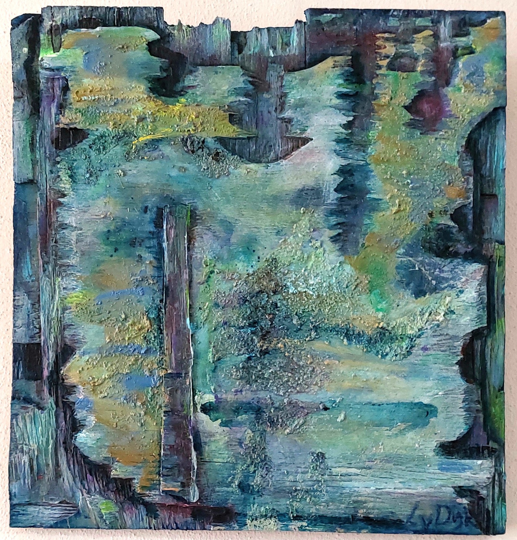 Iets in de buitenwereld intrigeert mij en door deze impressie uit te werken wordt zij blijvend deel van mijn binnenwereld. Laag na laag bouw ik aan de uiteindelijke vorm. Tijdens het werken komt er een stroom van associaties op gang. Het is een constant zoeken naar evenwicht tussen de verf en de andere materialen.