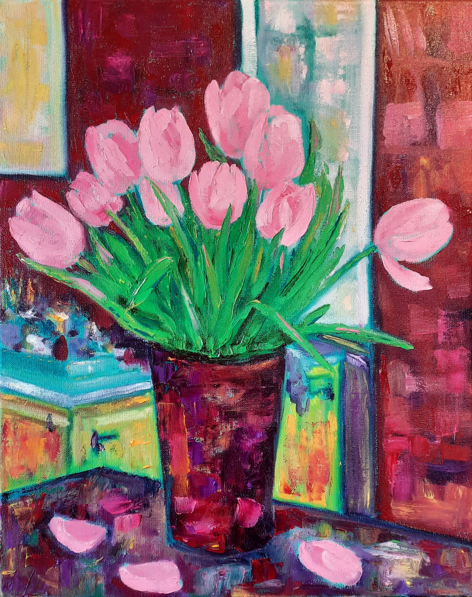Roze tulpen in rode vaas Olieverf op doek 40x50 cm 2025