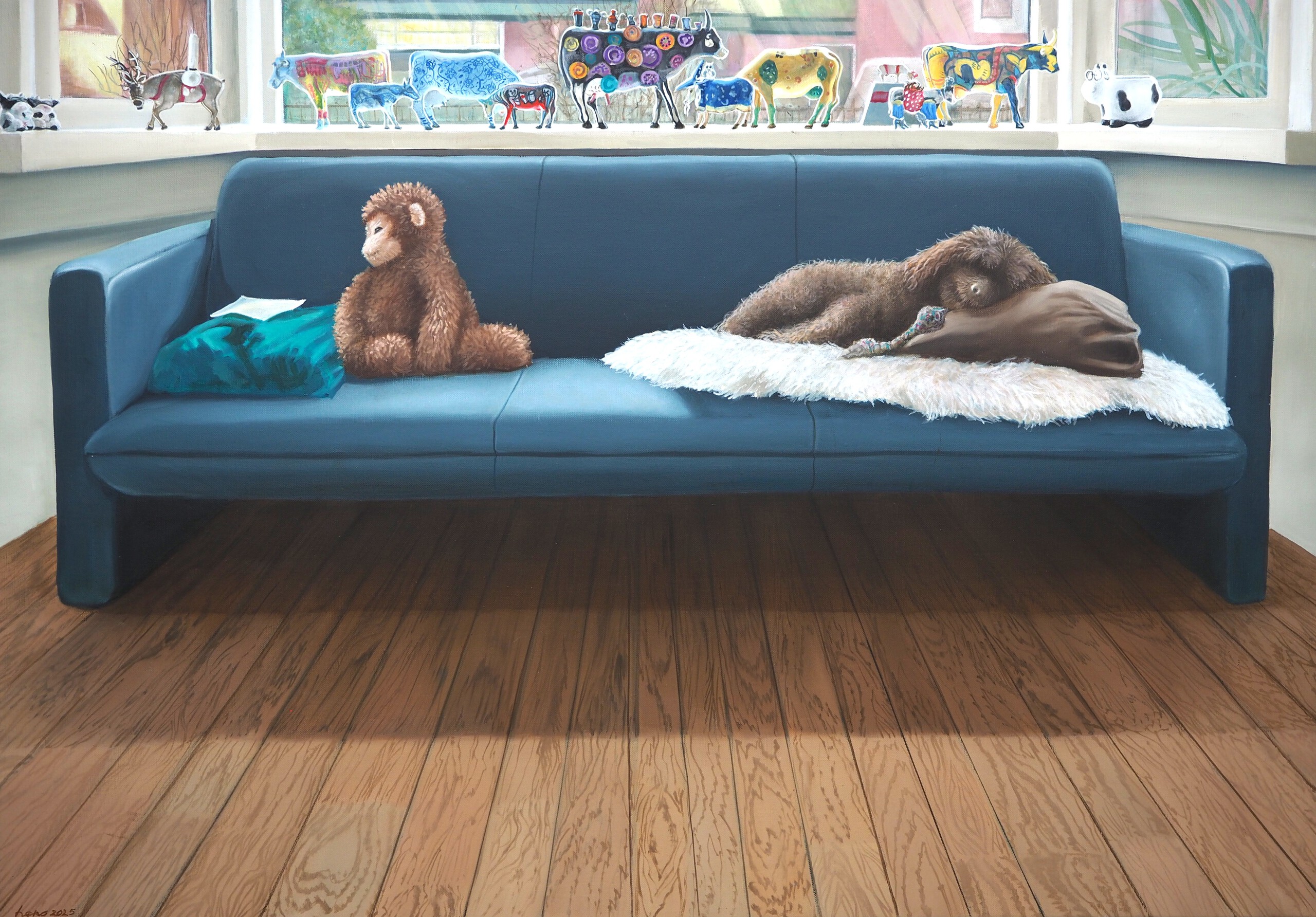 Een knuffel, een aap, lijkt geïnteresseerd naar een brief te kijken terwijl ons poedeltje diep in slaap is.