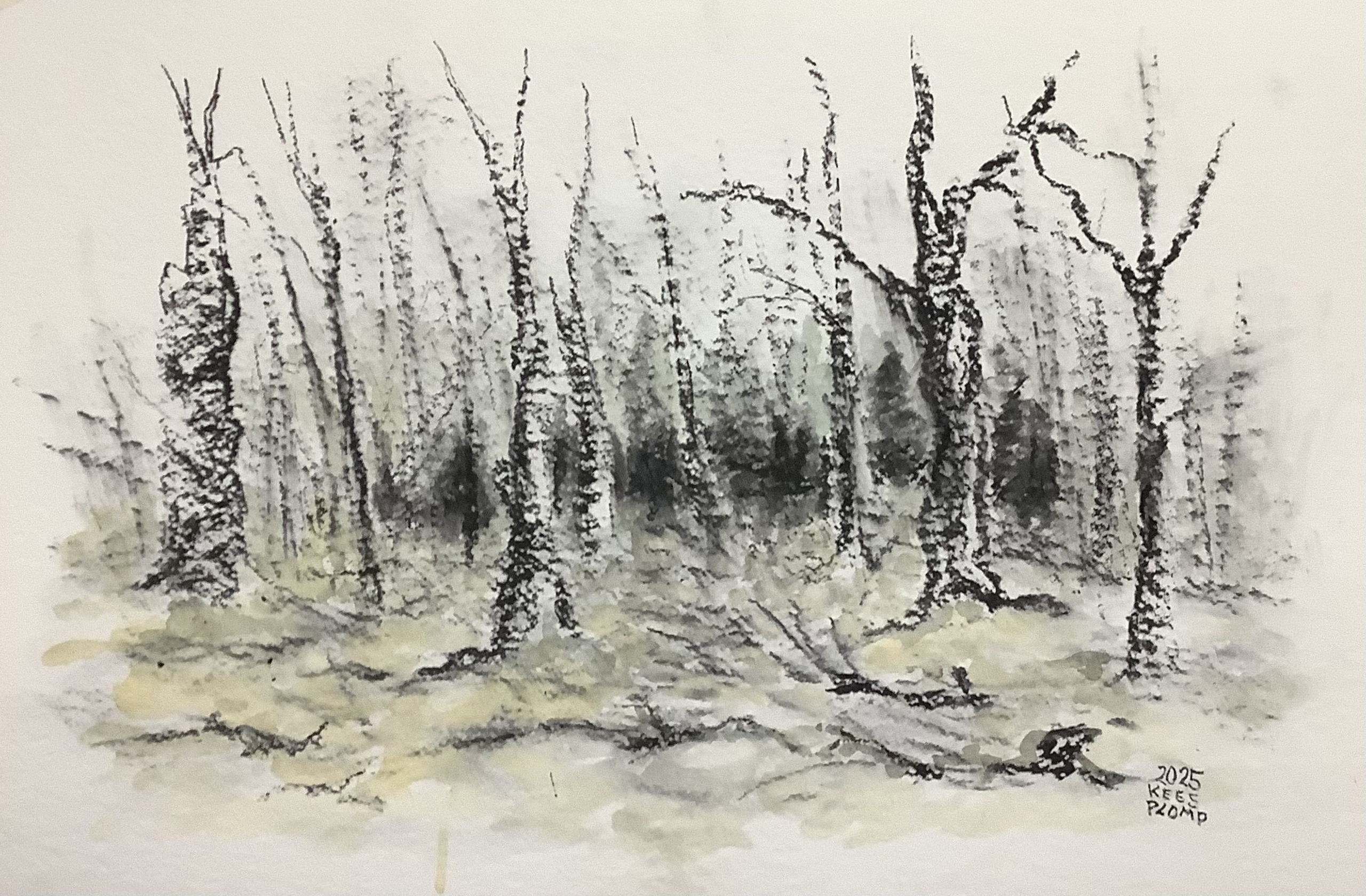 Winterlandschap met bomen, houtskool en verdunde acrylverf op handgeschept papier, " vrij" hangend, zonder passe-partout of lijst