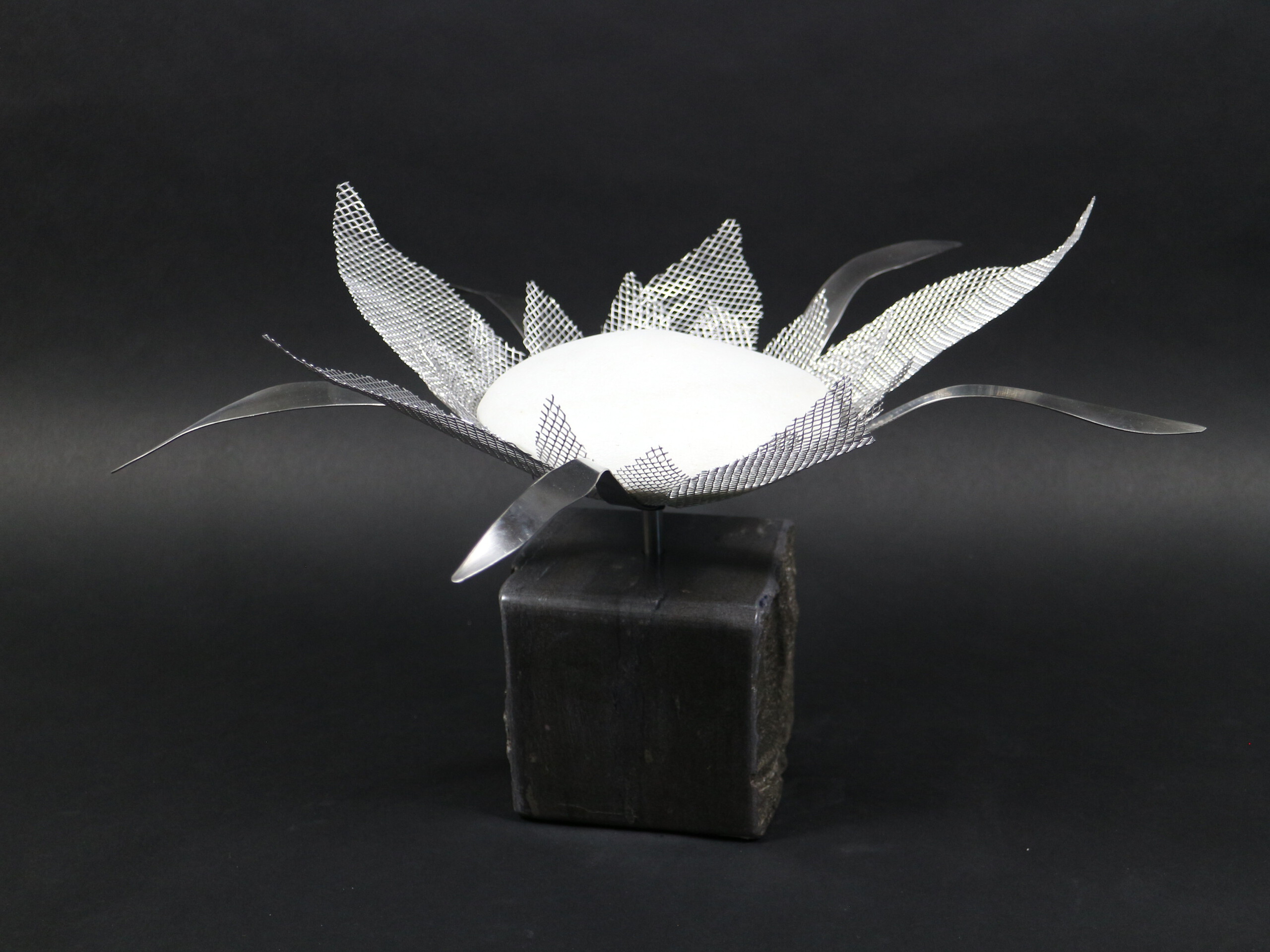 De serie Popping Flowers is gemaakt naar aanleiding van de zomer expositie bij Sille Galerie in Oudewater met als thema: GROEi. Bloemen vertederen altijd mensen en de natuur is in staat er een grote diversiteit in aan te brengen. Mijn Popping Flowers voegen daar nog een extra dimensie aan toe: het groeistadium is volkomen stilgezet en de materialen gaan levenslang mee. Dus geen zorgen dat de bloemen verwelken. Uiteraard behoeven ze ook geen voeding, bestrijdingsmiddelen en water te krijgen, zodat deze bloemen zeer milieu vriendelijk zijn en zeer duurzaam. De bloemen zijn bevestigd op een hardstenen sokkel.