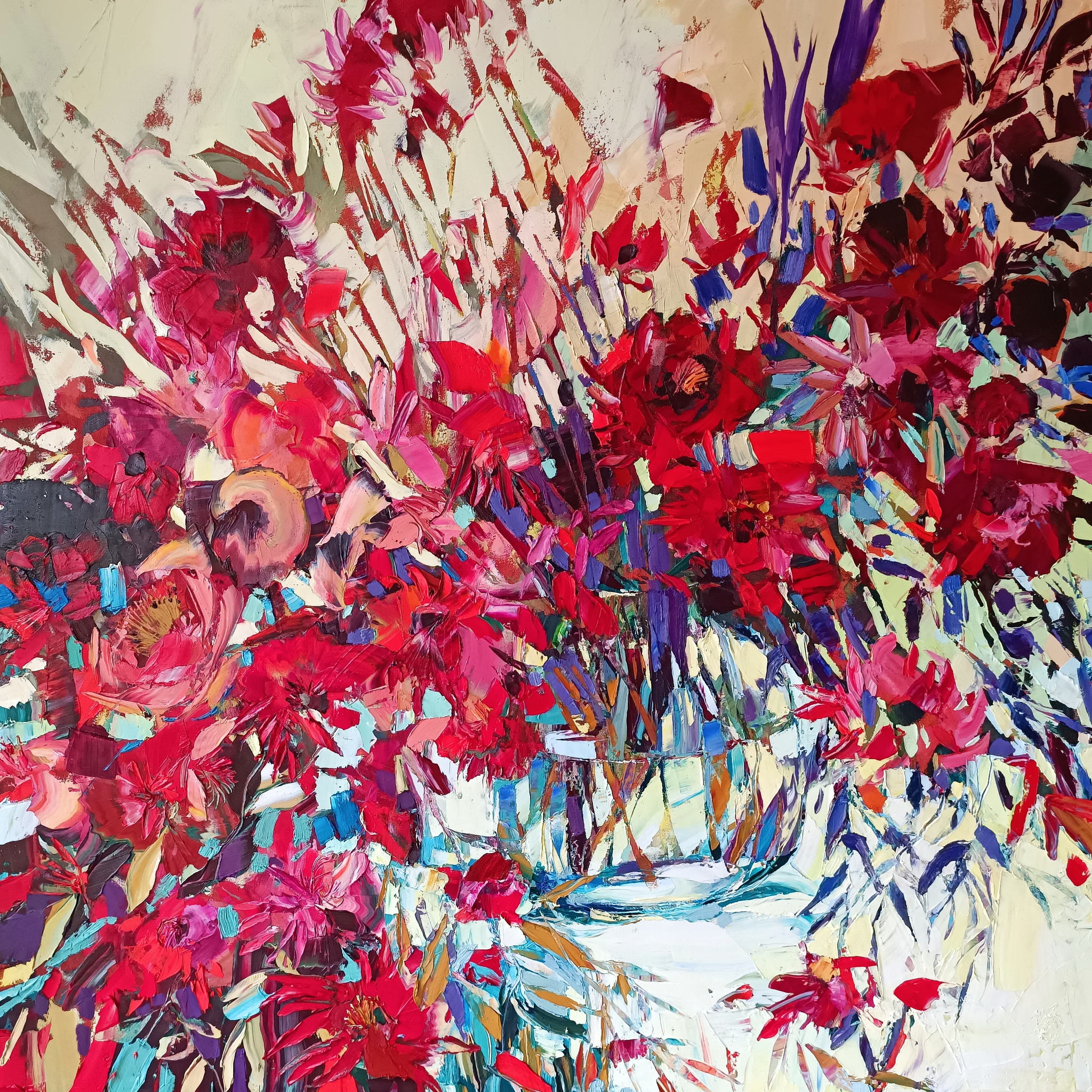 Rood Bloemen Glas Vaas Kleurrijk Vierkant Doek Kunst Moderne Red Groot Flowers Impressie Textuur Dynamiek Levendig Floral