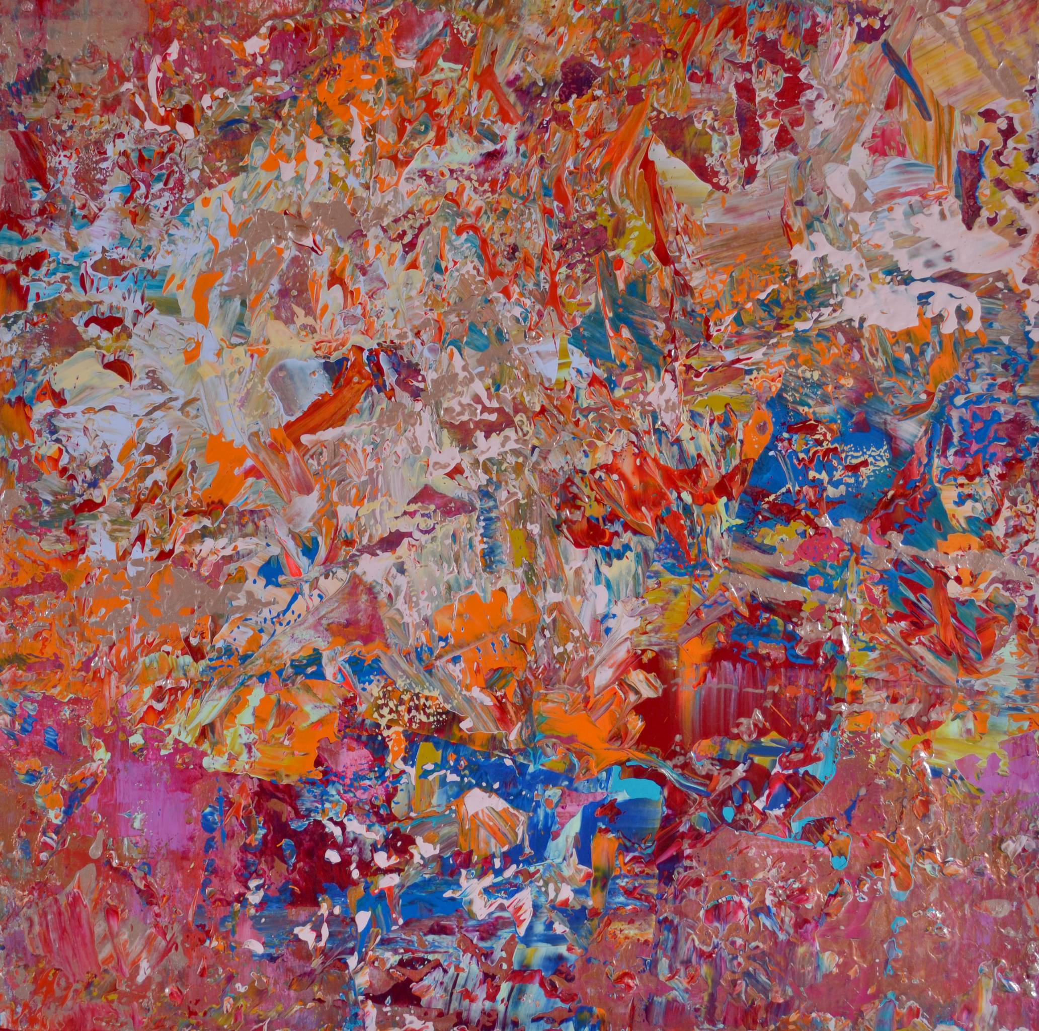 A celebration of renewal and energy, this abstract piece channels the riotous beauty of springtime in full bloom. Layers of vibrant hues—fuchsia, orange, cobalt, and deep rose—dance together in a metallic shimmer of copper, gold, and rose gold. “Spring Bouquet” is not a literal depiction, but an emotional response to the rush of colour, scent, and sensation that spring brings after the quiet of winter.