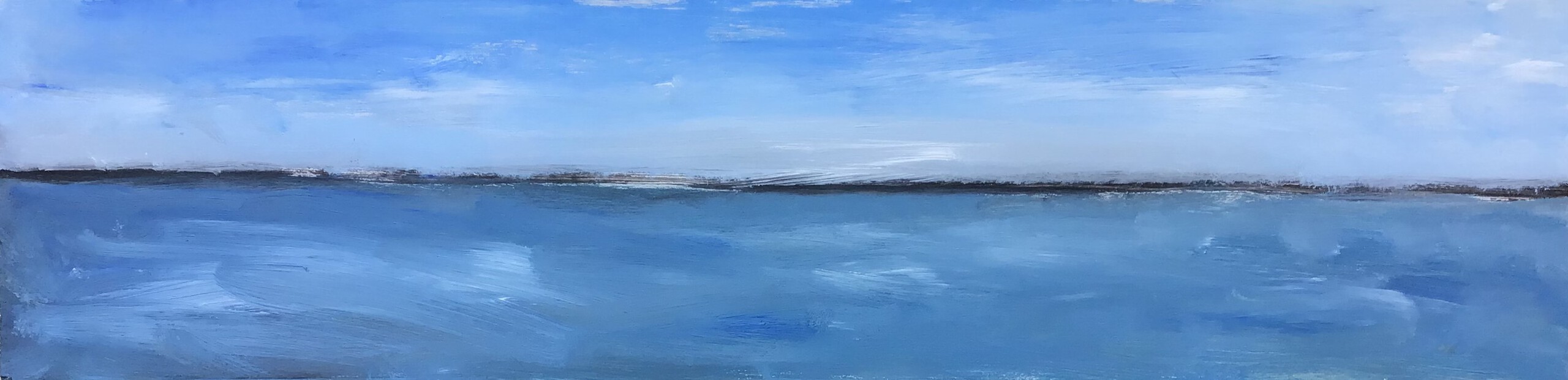 Langwerpig Texels werk met de zee, die eindeloze zee. Formaat 19 x 76 cm. Zonder lijst. Aflopend beeld. Zijklanten lichtblauw geschilderd