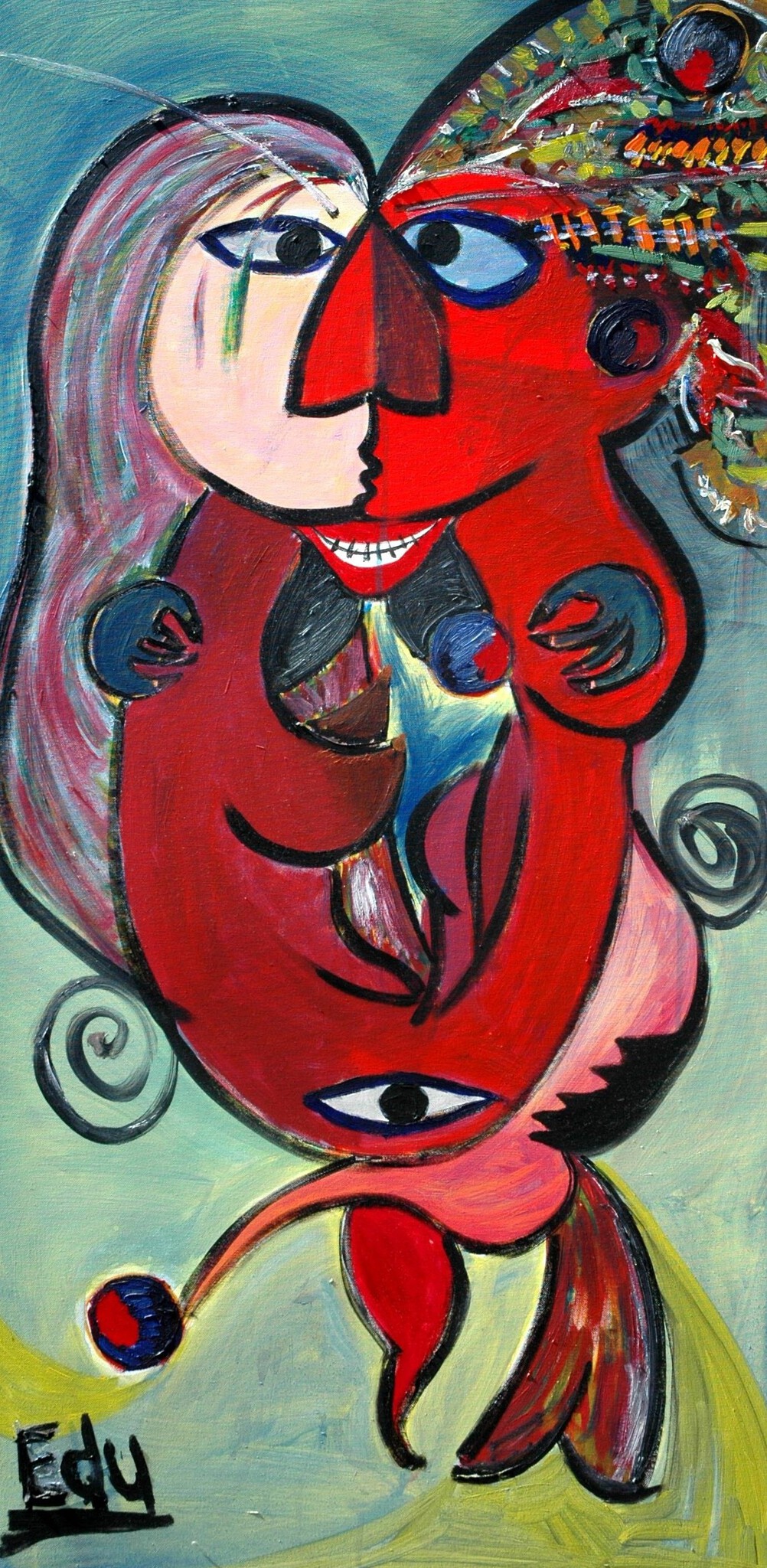 De huidige Edu schildert met waterbased olieverf op canvas, kenmerkend zijn de felle kleuren en de verstilde beweging.