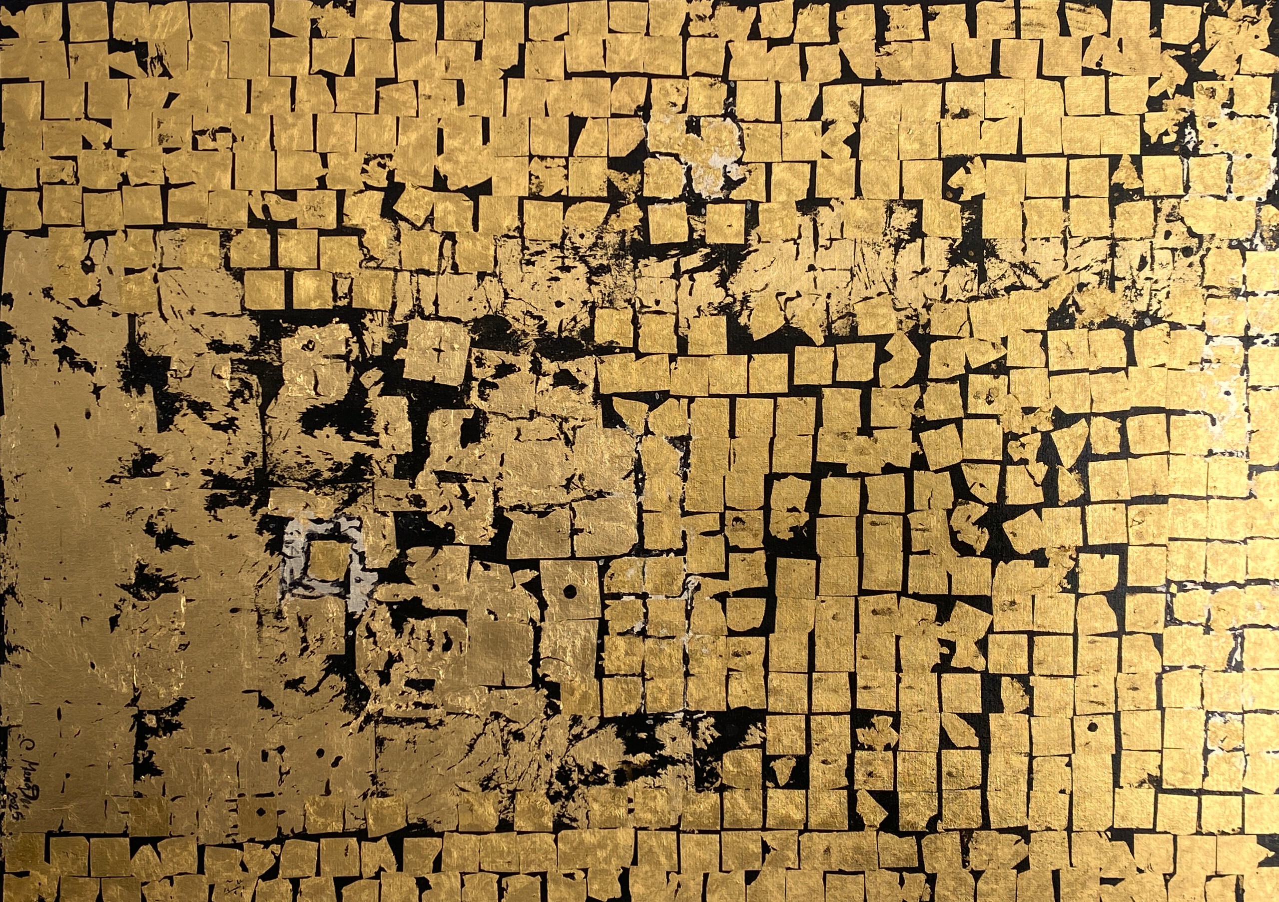 In a forgotten city of gold, hidden beneath layers of time and silence, there once stood a grand hall where every surface was gilded in shimmering metal. The walls, the floors, even the ceilings were lined with golden tiles, each one etched with the stories and symbols of a once-thriving civilization. The city was known as Aurum, a place where the sun never set, and the air was always warm with light. This painting, abstract yet hauntingly detailed, is said to be a fragment of the last surviving wall of Aurum. Over centuries, the gold tiles have chipped and faded, revealing the darkness underneath — the silence of abandonment, the creeping rot of time. What was once perfect symmetry has now cracked into beautiful chaos. The black voids in the image are not just absences; they are echoes of voices, laughter, footsteps — remnants of a people who lived in brilliance and vanished without a trace.