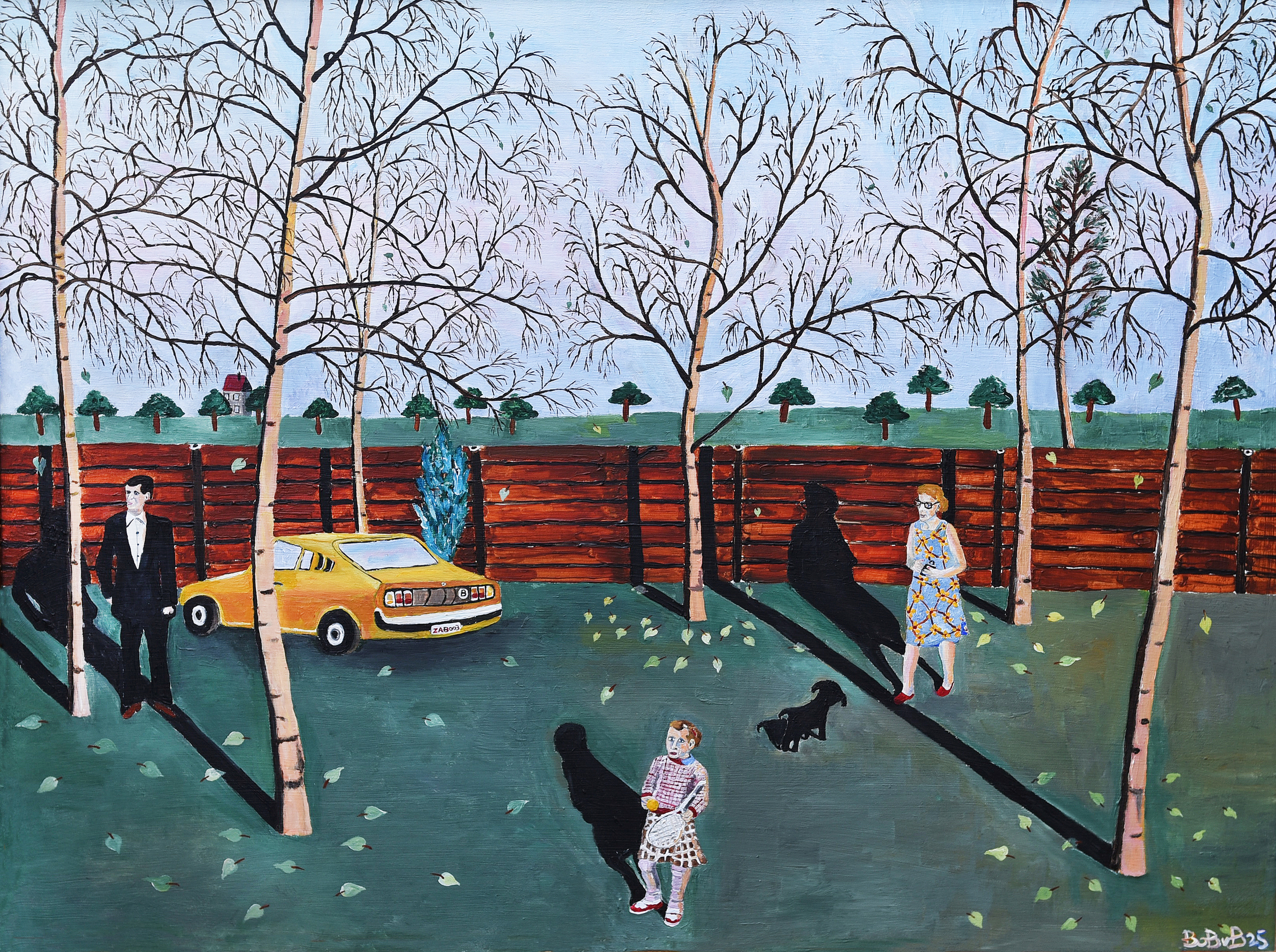 Dit schilderij is afgeleid van een aantal foto's van de Belgische fotograaf Harry Gruyaert, het landschap is een foto (Belgie), en de 3 figuren (mensen) komen uit andere foto's van hem op diverse plekken genomen. Ik heb dit allemaal in het schilderij samengebracht als een soort van ode aan de fotograaf! Het is geschilderd in acrylverf op hout met een 2de hands omlijsting er omheen.