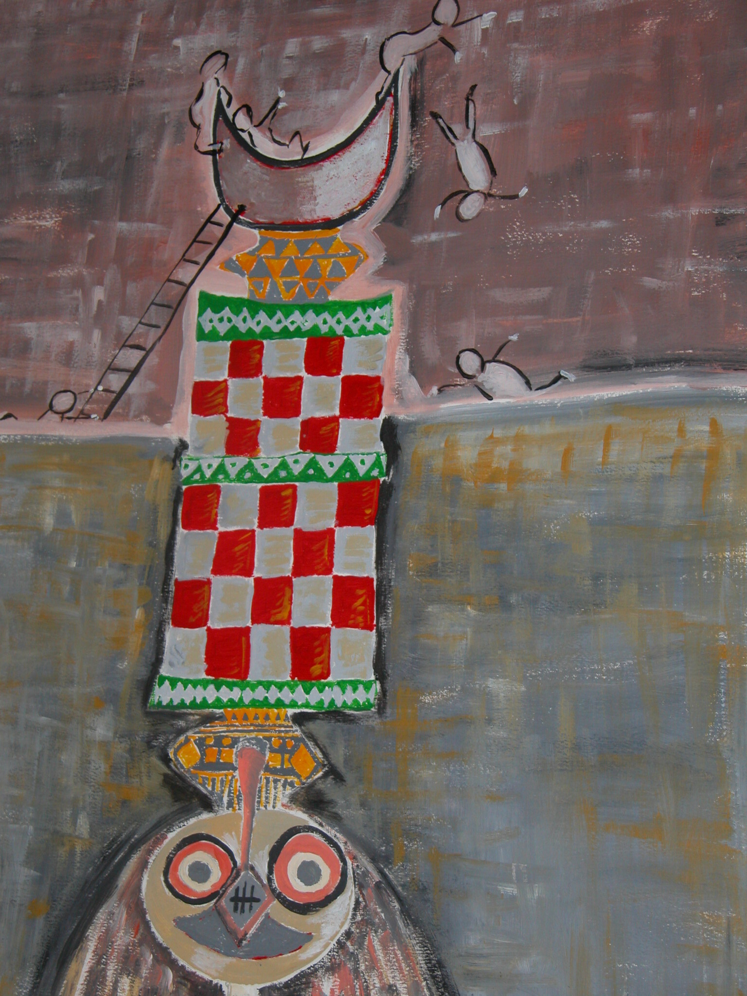 Toen waren die grappige kleine mannetjes er al bij. En maar rondjes lopen, duiken en zwemmen. Ik had toen wat boeken over Afrikaanse maskers gelezen.