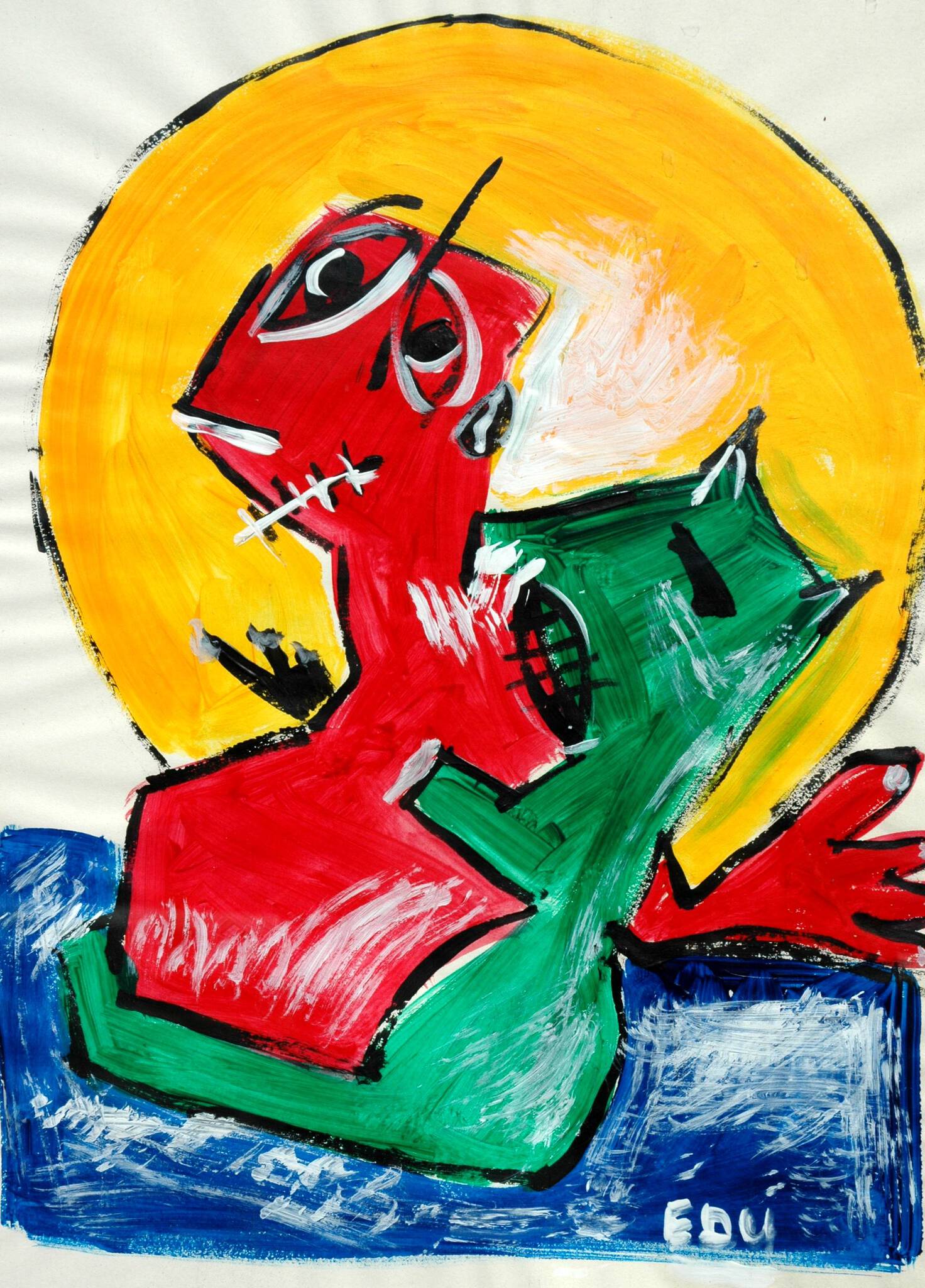 De huidige Edu schildert met waterbased olieverf op canvas, kenmerkend zijn de felle kleuren en de verstilde beweging.