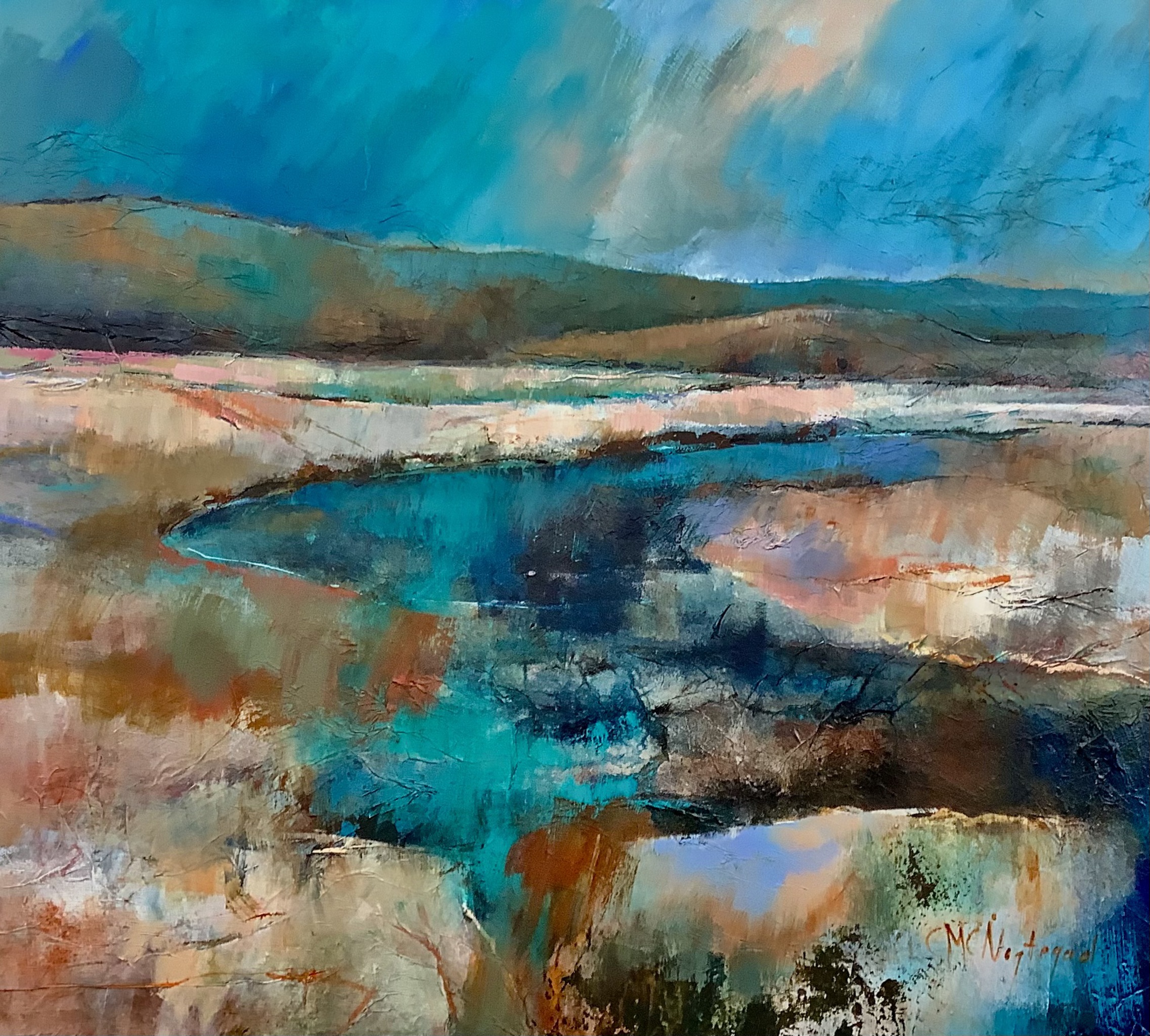 Een kleurrijk schilderij in warme kleuren .Er zijn geen planten of bomen te zien , het gaat uitsluitend om de ruimte. Maar ik wil landschappen maken waar je als toeschouwer zelf zou willen lopen.