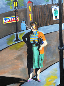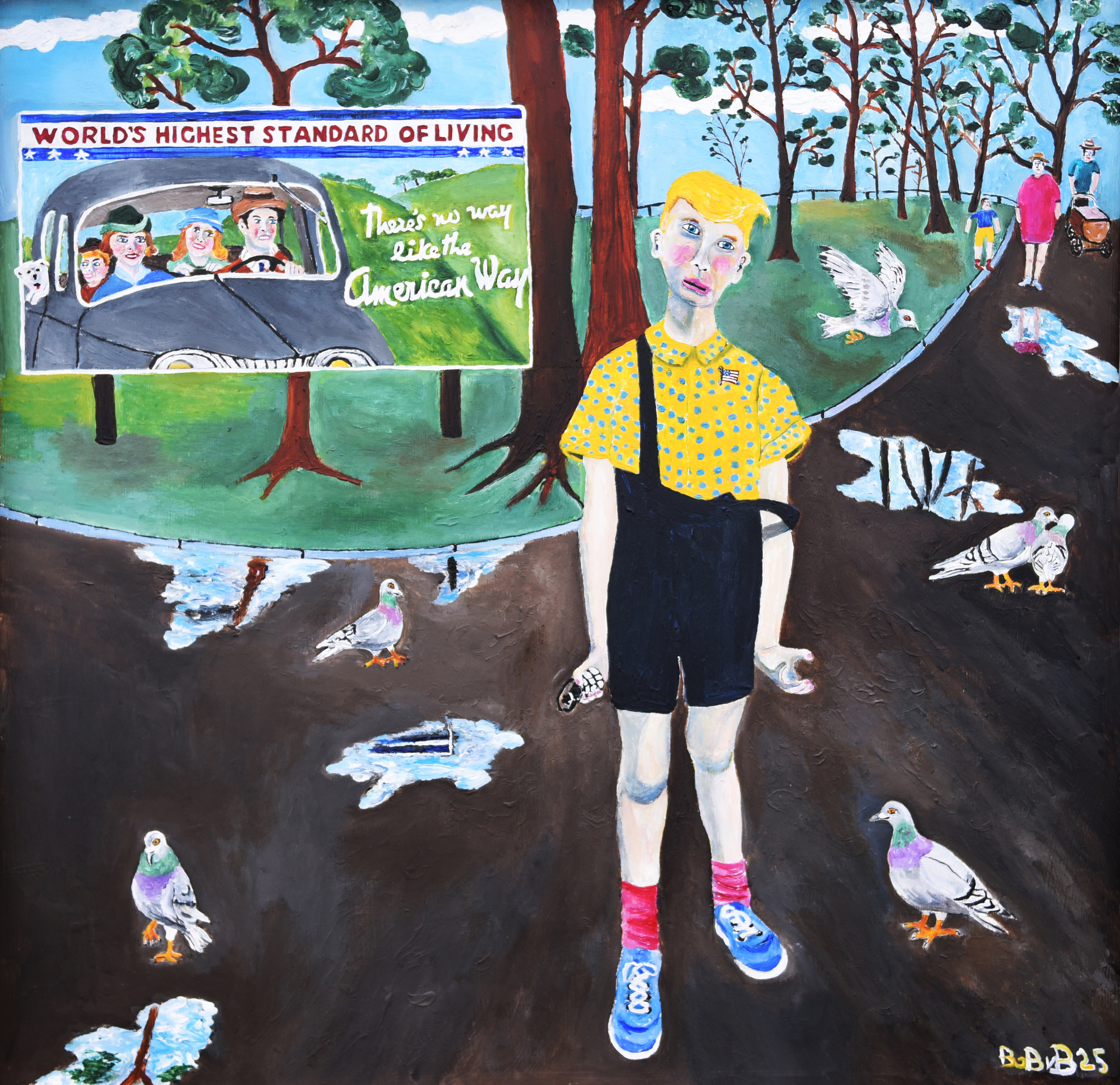 Dit schilderij is afgeleid van 2 foto's, het jongetje met de speelgoed handgranaat komt uit een foto van de New Yorkse fotografe Diane Arbus, en het billboard in de achtergrond uit een foto van de Amerikaanse fotografe Margaret Bourke- White. Ik heb het jongetje een soort van Trumpiaans kapsel gegeven, het is een soort van visueel commentaar geworden op het huidige politieke "klimaat" in de USA en de rest van de wereld!