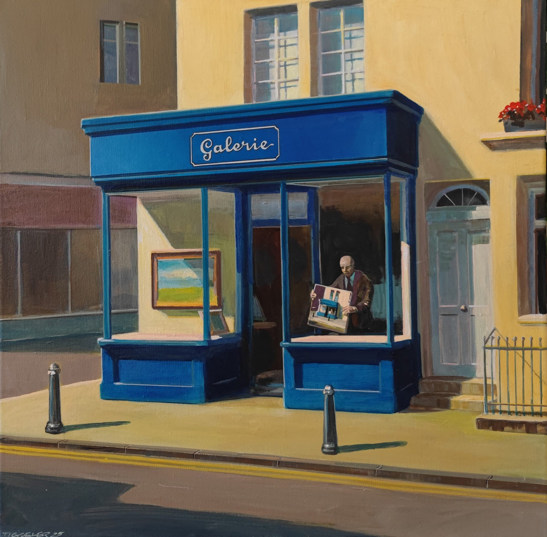 Een galeriehouder plaatst een nieuwe aanwinst in de etalage. Het schilderij in zijn hand lijkt, niet helemaal toevallig, op het schilderij waar hij zelf op staat – een beetje een Droste-effect.