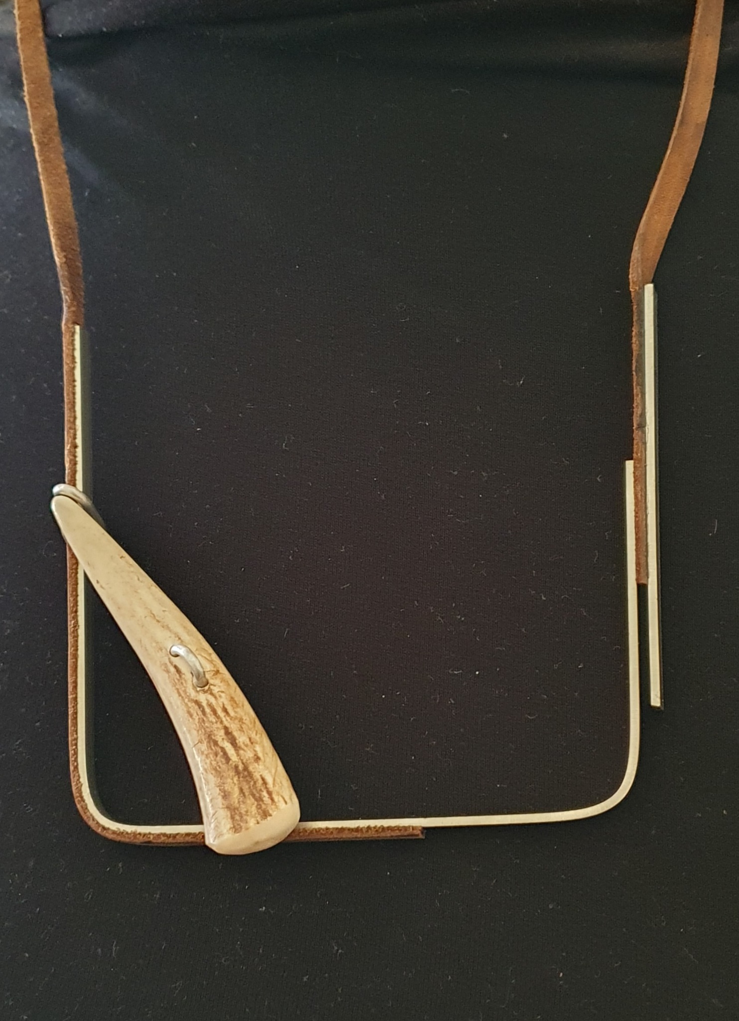 Als het maar enigszins kan lijmen we we niet maar gebruiken we andere technieken. Natuur laat zich ook vaak niet zo goed lijmen. In dit geval knopen en klemmen we een stuk hoorn in een haakse hoek van RVS. De veter maakt er alsnog een soepel geheel van.