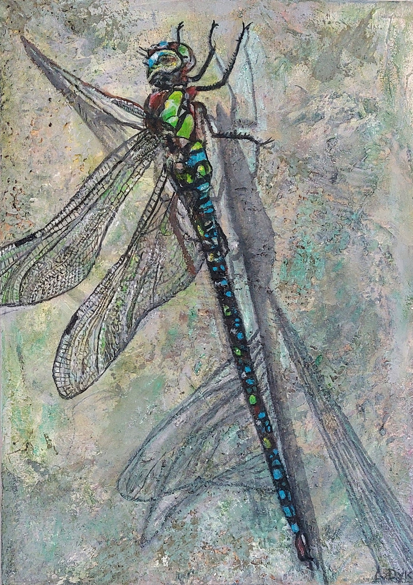 Iets in de buitenwereld intrigeert mij en door deze impressie uit te werken wordt zij blijvend deel van mijn binnenwereld. Laag na laag bouw ik aan de uiteindelijke vorm. Tijdens het werken komt er een stroom van associaties op gang. Het is een constant zoeken naar evenwicht tussen de verf en de andere materialen.