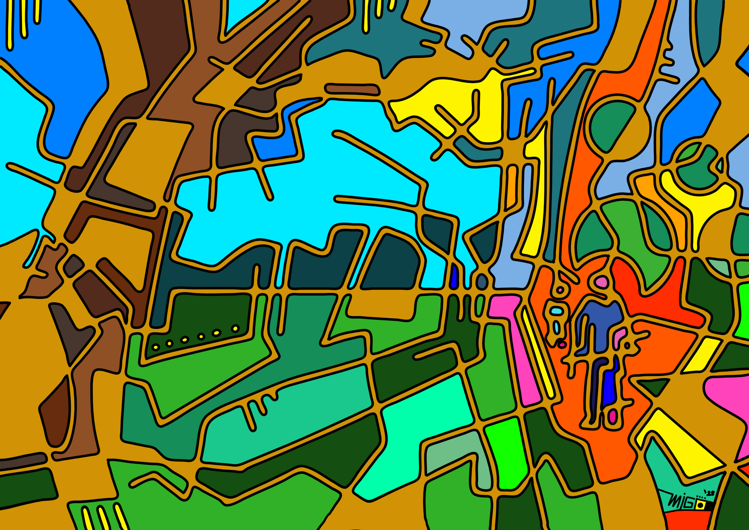 Maurice tekent op papier met pen en inkt en op iPad. Het drukke lijnenspel met opmerkelijke kleurcombinaties van patronen en figuratieve elementen biedt een ontsnapping aan de dagelijkse sleur.