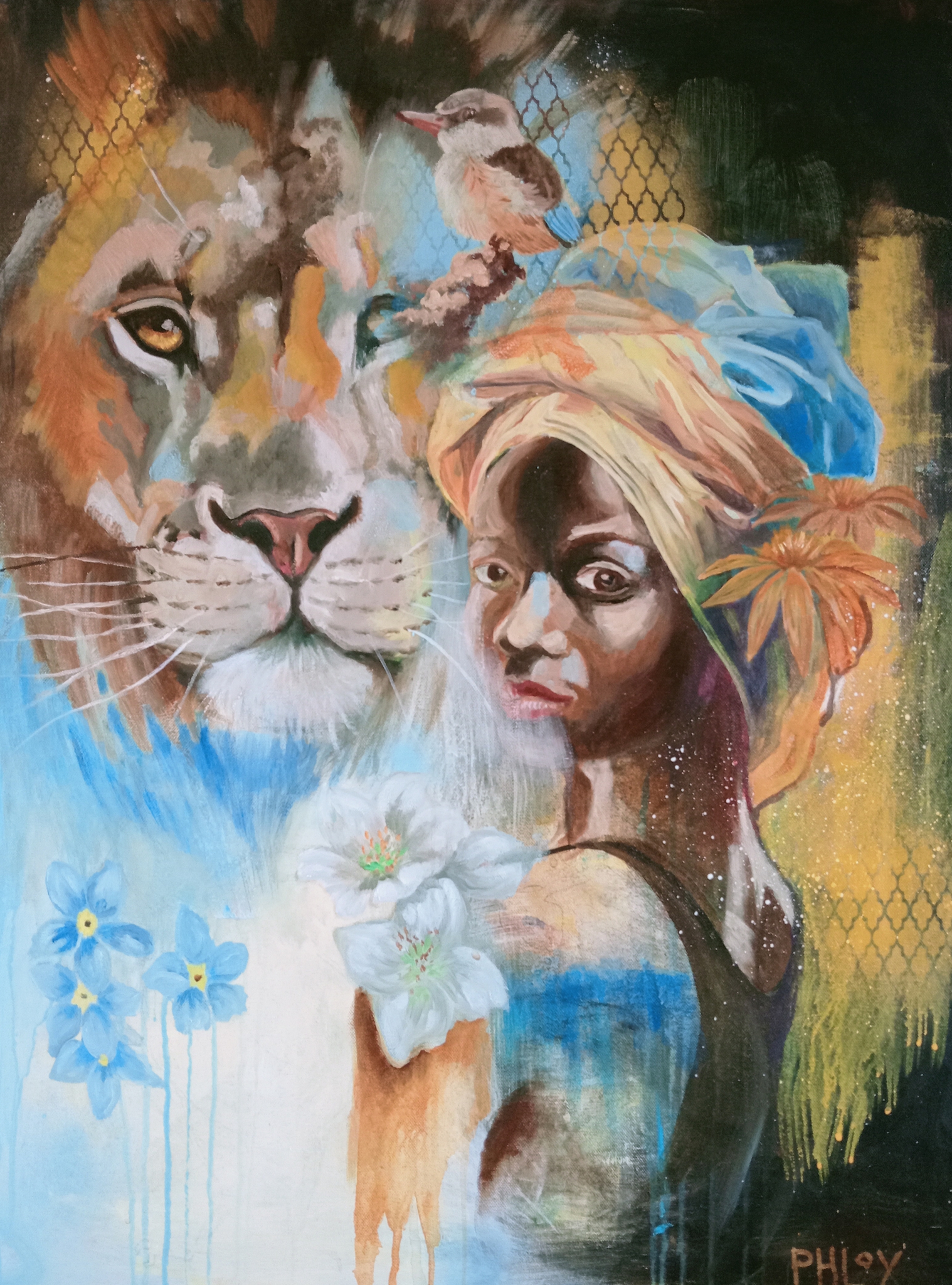 Het schilderij had ook 'schatten van Africa' kunnen heten. We zien een zwart meisje met een prachtige doek om haar hoofd. De leeuw is in de achtergrond geschilderd alsof hij over het meisje waakt. Het geheel wordt opgeluisterd door de bloemen en het vogeltje. Mijn reis naar Tanzania heeft mij geinspireerd voor het schilderen van dit doek.