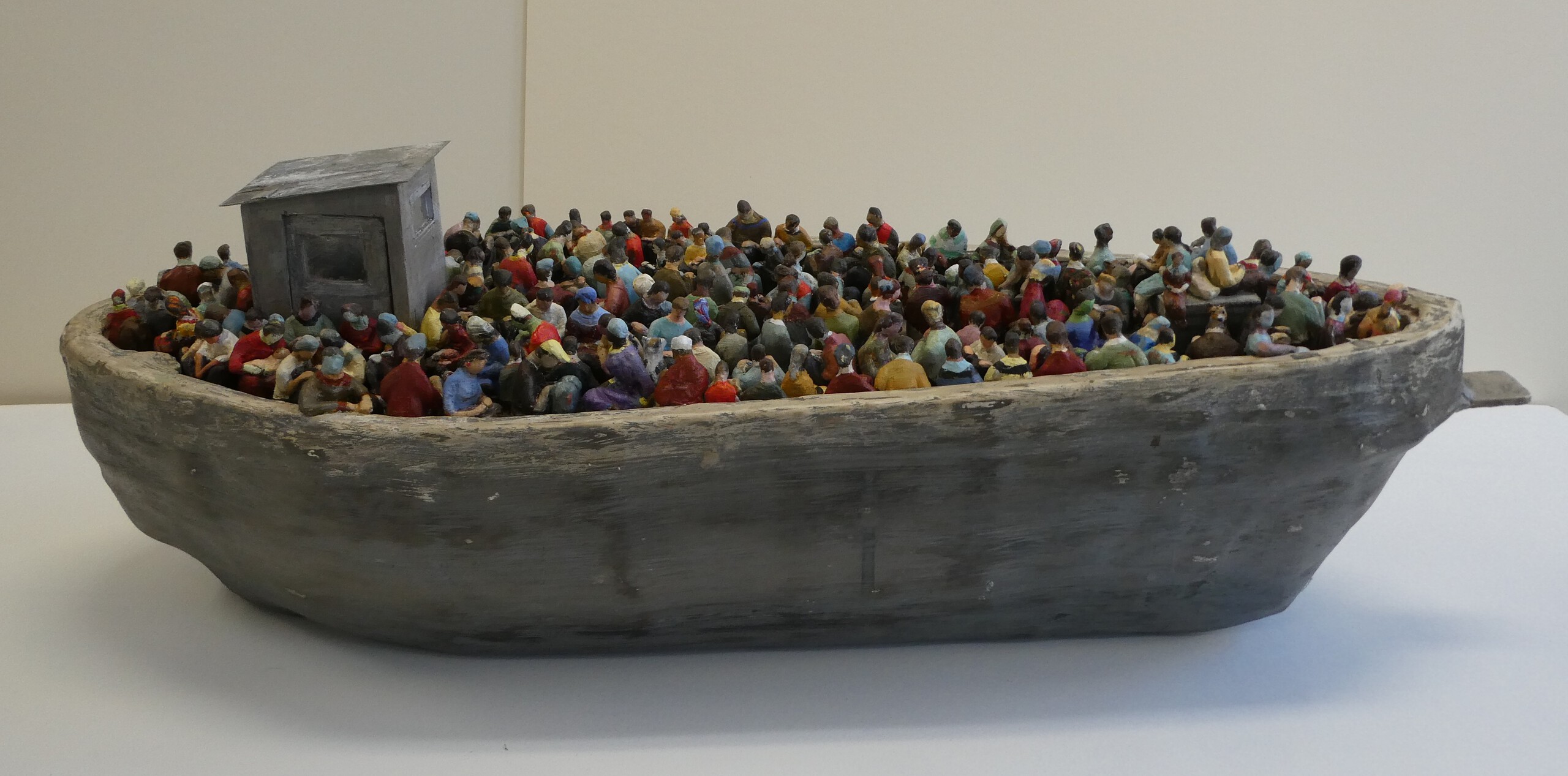 Boot, 64 cm lang (gips ,hout,bijenwas) door Peter Dejong. figuren in terra cotta en olieverf door Arthur Stam.