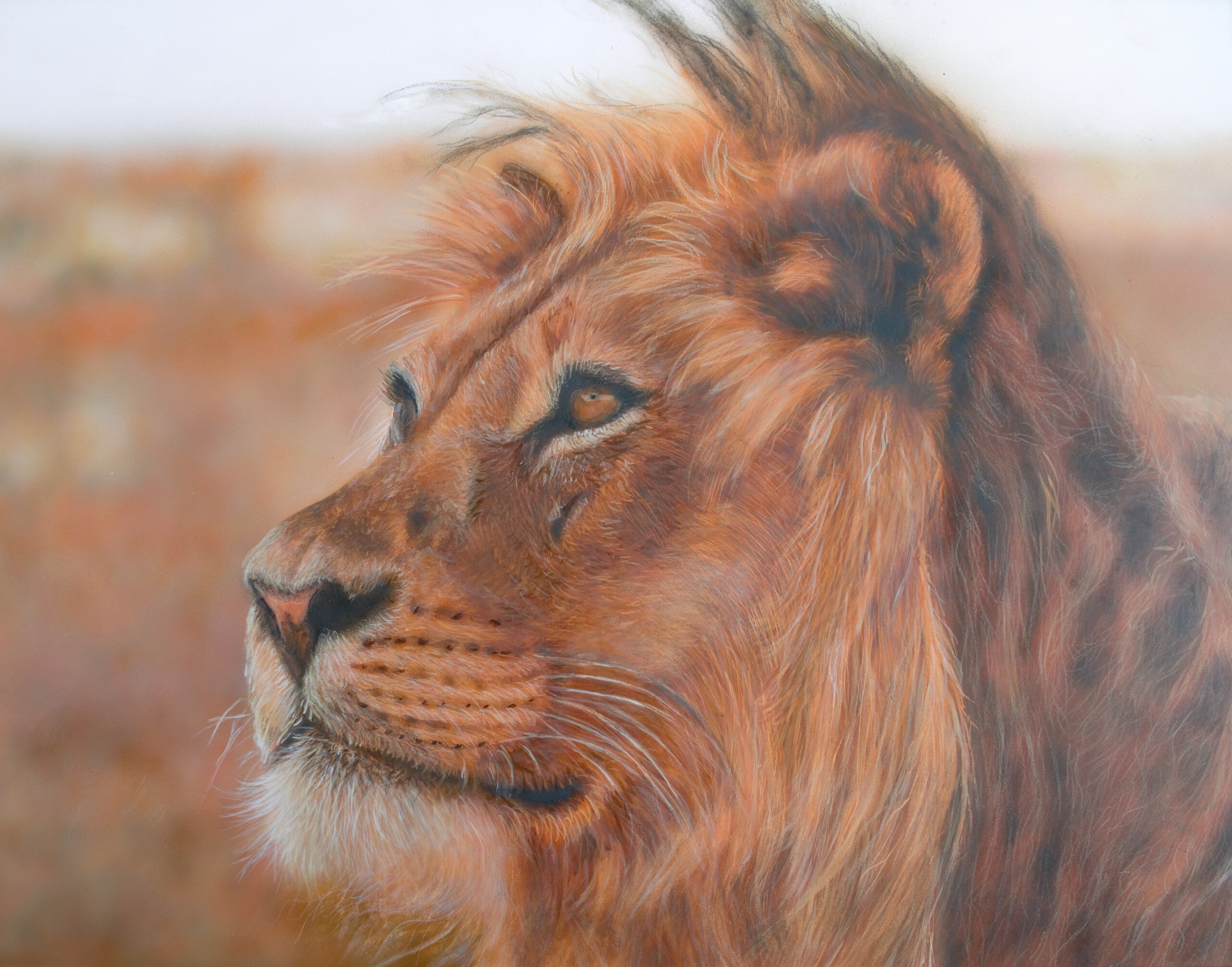 Deze prachtige leeuw werd gemaakt tijdens een workshop met Marissa Oosterlee. Het is geschilderd met acrylverf op liquid paper, een heel bijzonder materiaal. De hoofdkleuren in het schilderij zijn Burnt Umber en Sienna—mijn favorieten—die het werk een warme en rustgevende uitstraling geven.